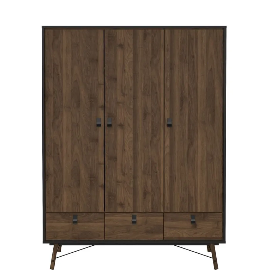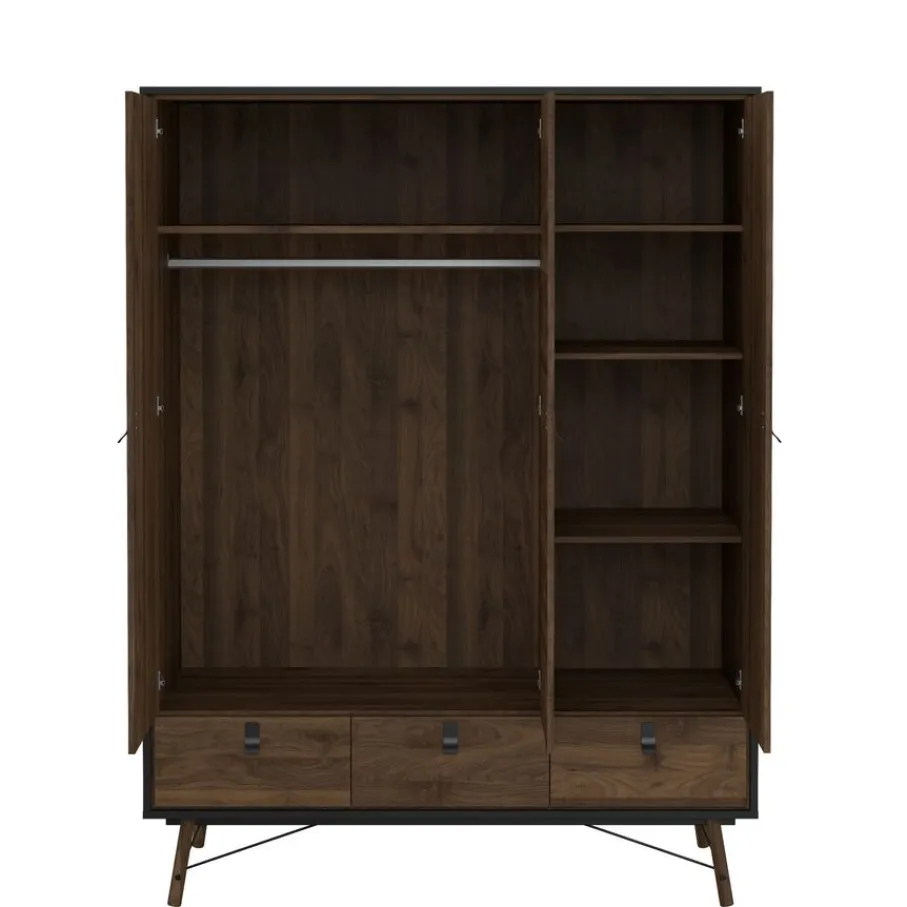 Deze kledingkast heeft links een dubbeldeurs vak met een plank en roede erin. Aan de rechterkant zit een enkeldeurs vak met 3 planken erin. Verder zijn er onderin nog 3 handige lades, waardoor Denver ruime opbergmogelijkheden biedt. De metalen handgrepen op de deuren en lades zorgen voor een speels accent.