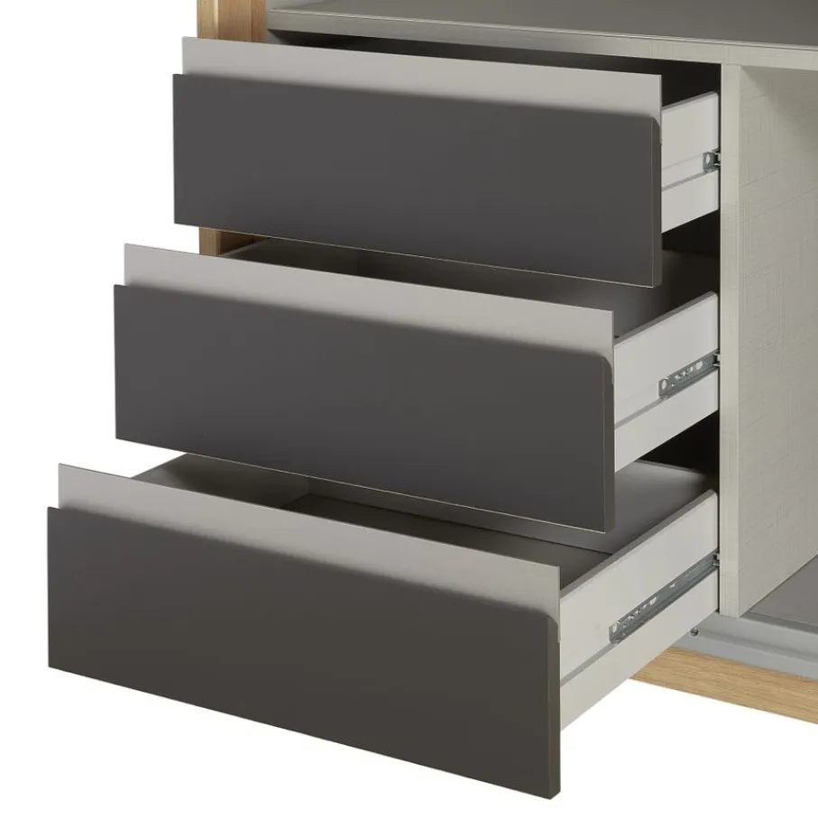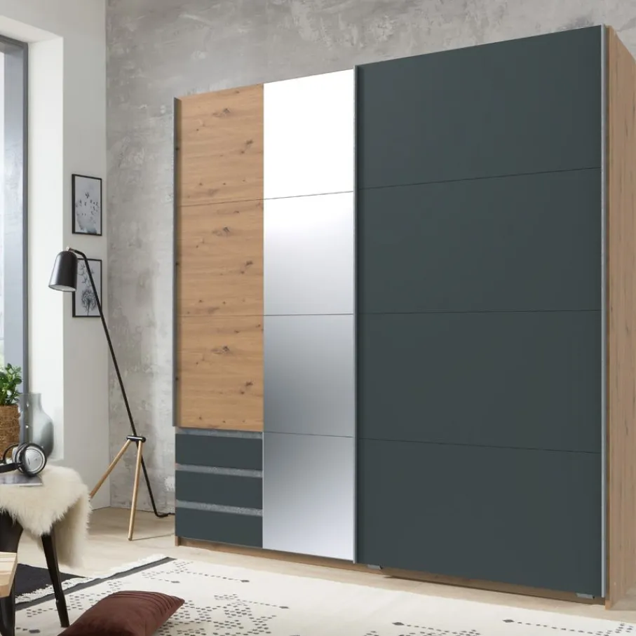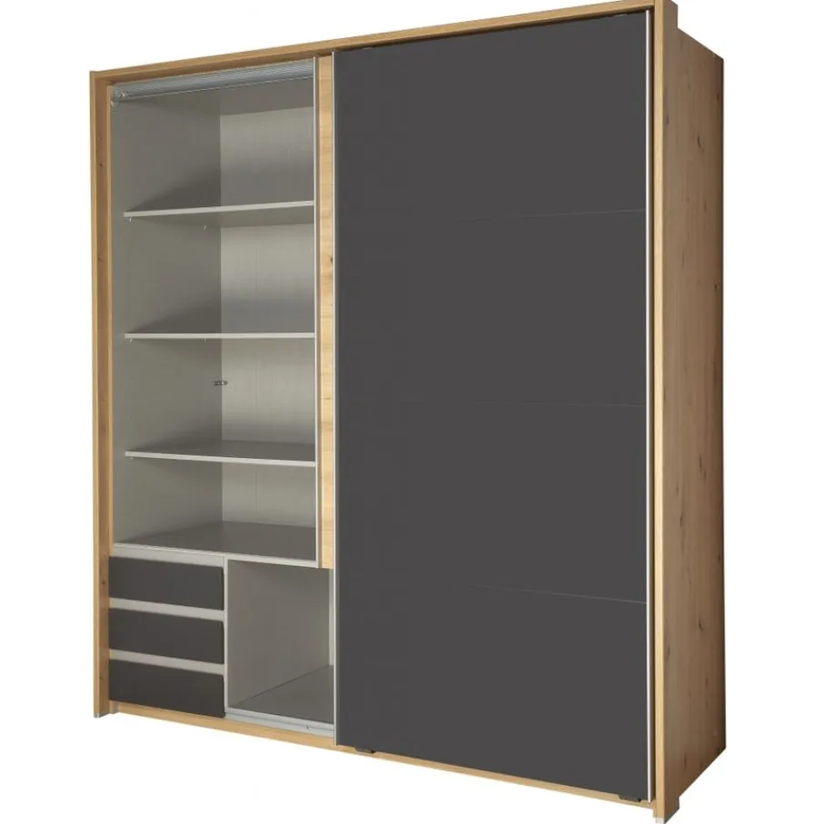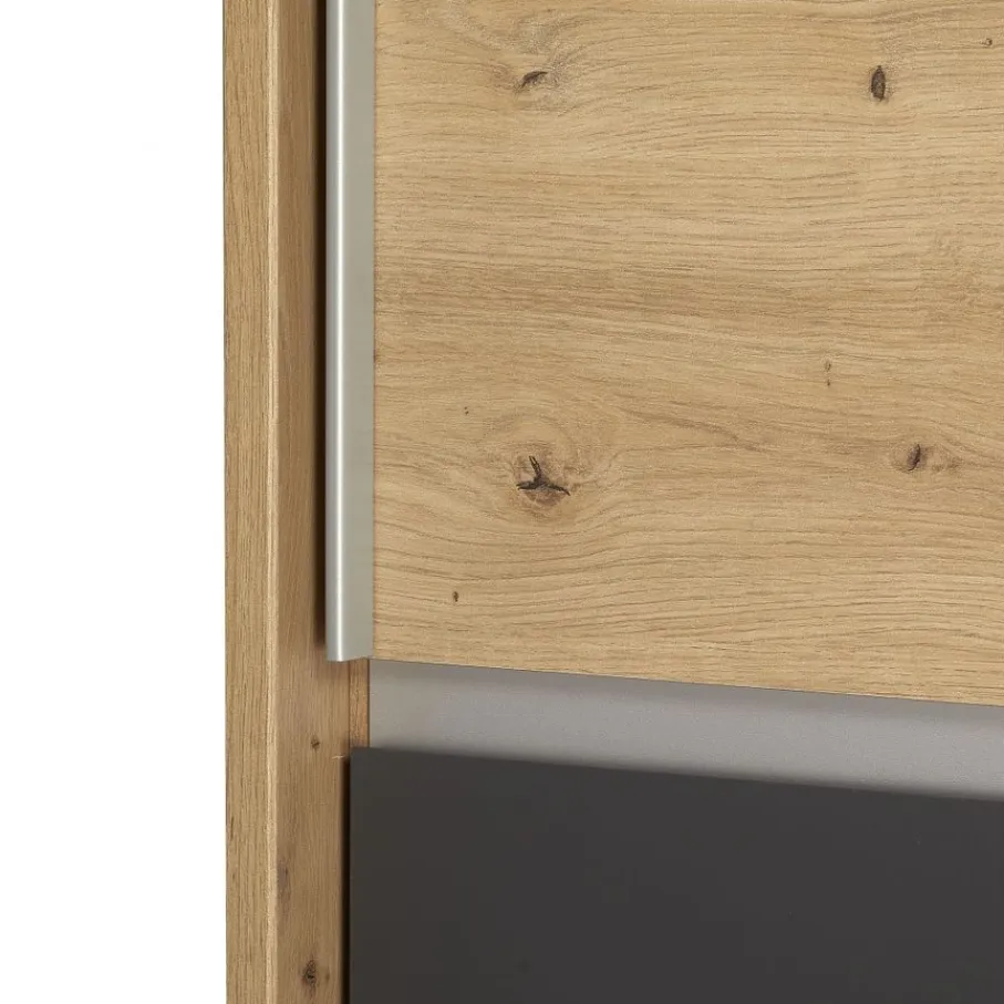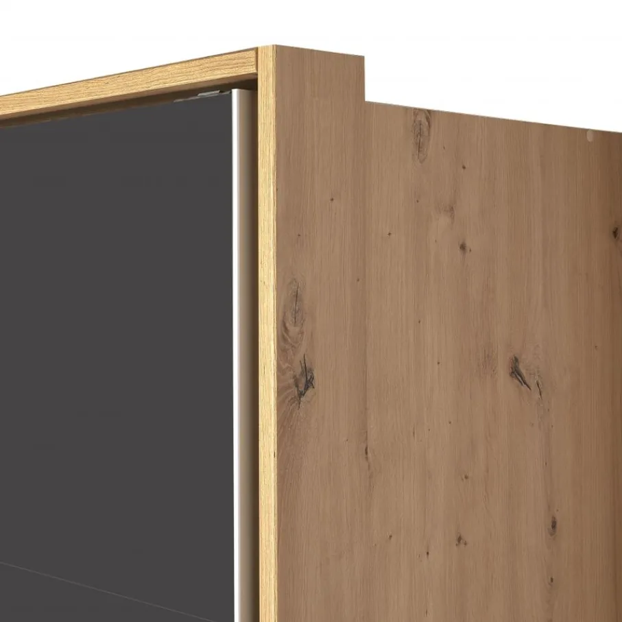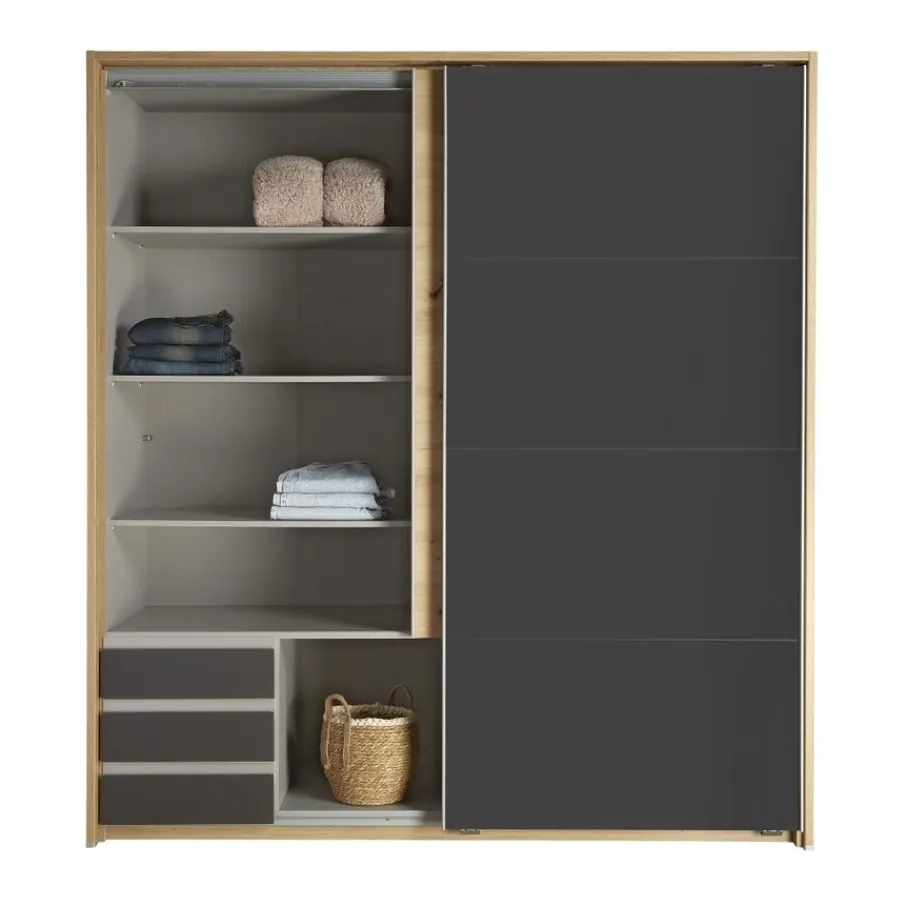 - Geef je slaapkamer direct een stijlvolle upgrade met deze eigentijdse kledingkast die eiken houtlook combineert met modern grafiet.