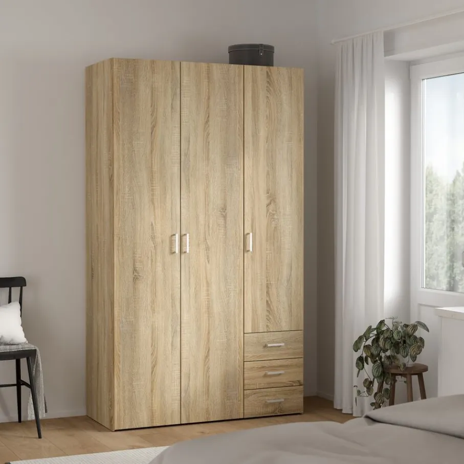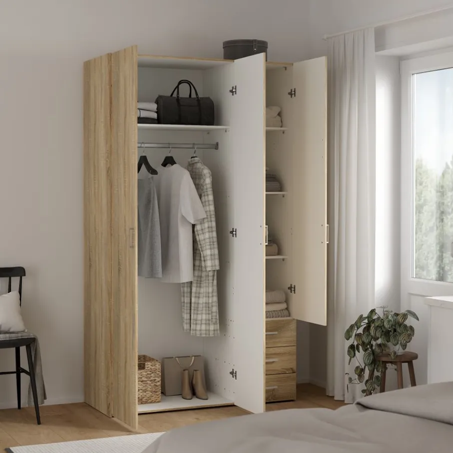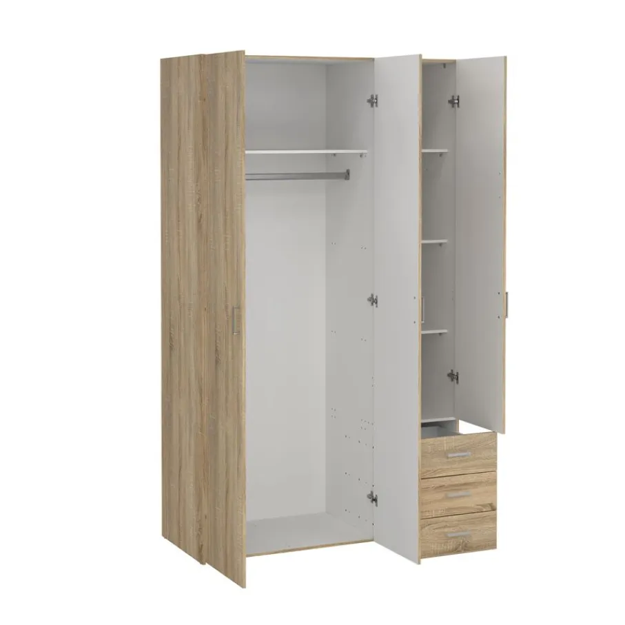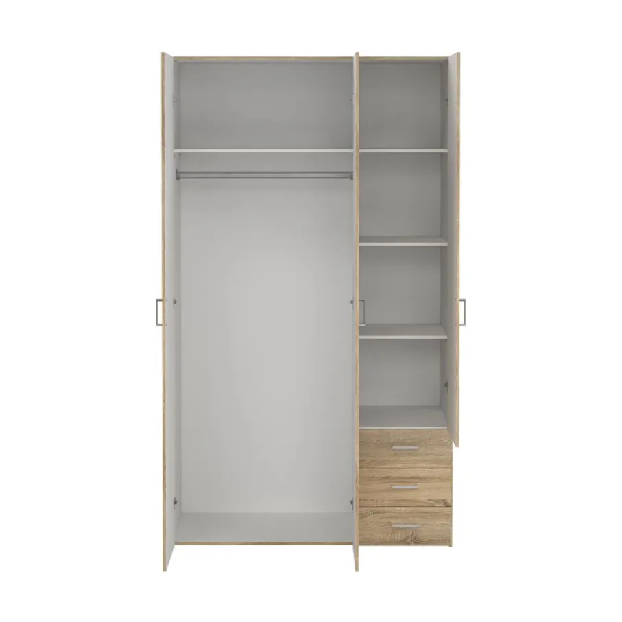 Kledingkast Harper is een praktische toevoeging voor elke kamer. De kast heeft een handige indeling met links een vak met een dubbele deur met daarachter een roede en een legplank. Rechts zit een vak met een enkele deur met daarachter drie legplanken. Daaronder zijn er ook nog drie lades en zo berg je alles overzichtelijk op, en is jouw kamer altijd netjes.