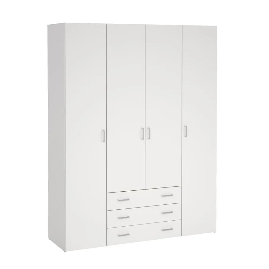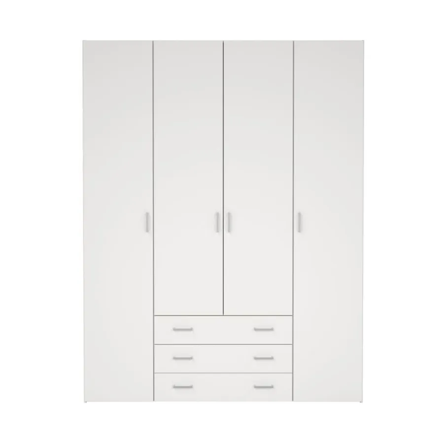 Kledingkast Harper is een praktische toevoeging voor elke kamer. De kast heeft een handige indeling met links en rechts een vak met een enkele deur. In deze vakken van elk 37 cm breed zitten vier legplanken. In het midden zit een breed vak met een dubbele deur met daarachter een roede en een legplank. Daaronder zijn er ook nog drie brede lades en zo berg je alles overzichtelijk op, en is jouw kamer altijd netjes.