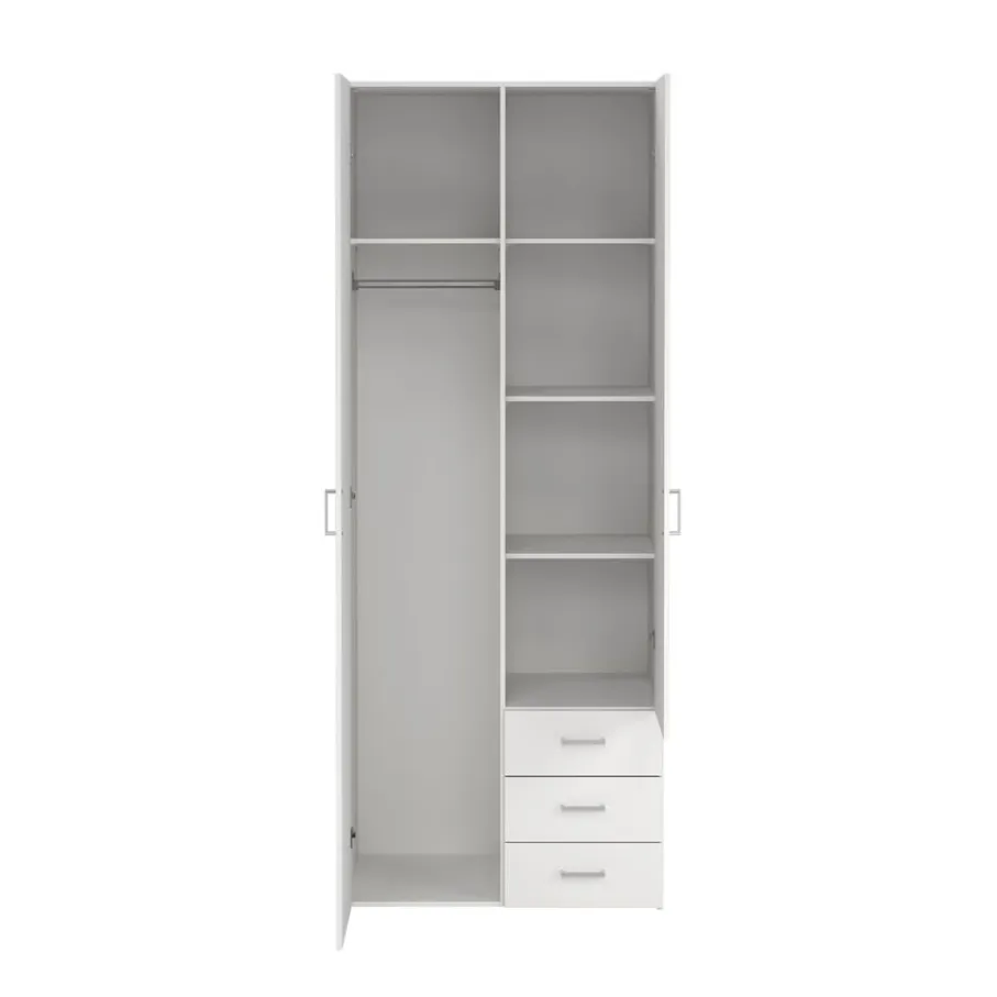 Kledingkast Harper is een praktische toevoeging voor elke kamer. Achter de deuren vind je een handige indeling: aan de ene kant een roede om al je kleding netjes op te hangen met erboven een plank en daarnaast drie legplanken voor extra opbergruimte. Verder zijn er ook nog 3 lades en zo berg je alles overzichtelijk op, en is jouw kamer altijd netjes.