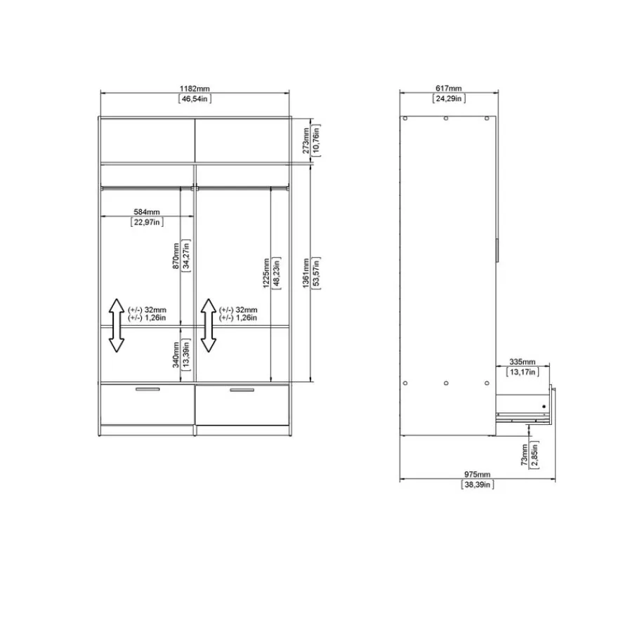 - Houd al je favoriete outfits netjes georganiseerd met een handige indeling van twee roedes, twee legplanken en twee diepe lades.