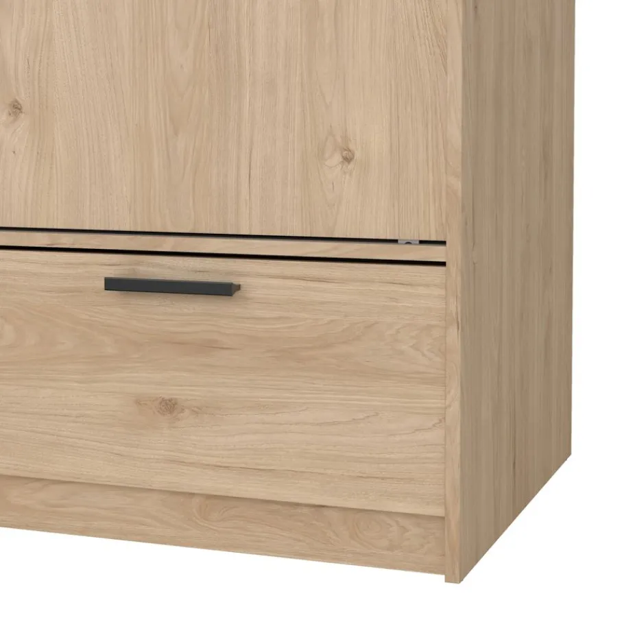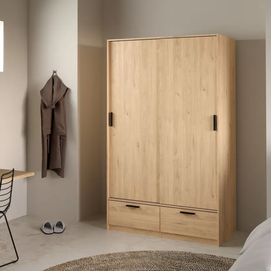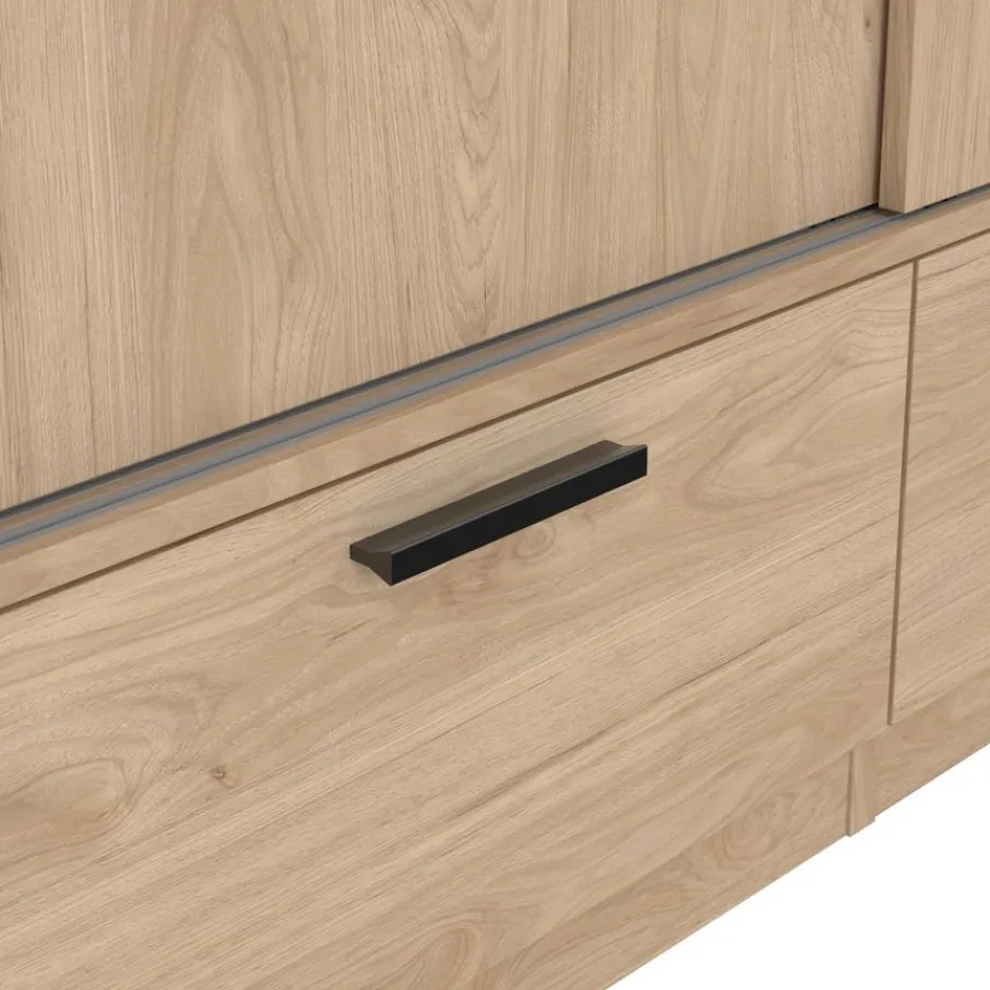 - Geef je slaapkamer direct een stoere en natuurlijke uitstraling met deze moderne kledingkast in warme eiken houtlook en strakke zwarte grepen.