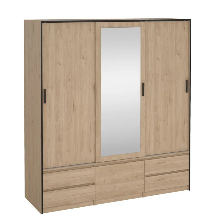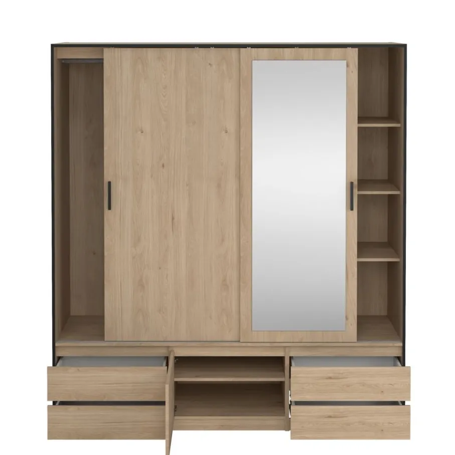 - Geef je slaapkamer een warme, moderne uitstraling met deze prachtige kledingkast in sfeervolle eiken houtlook en strakke zwarte details.