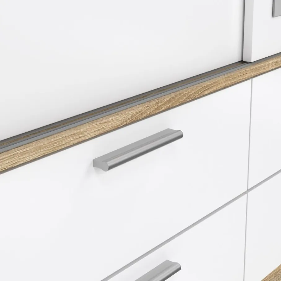 Deze Jasper kledingkast heeft 3 schuifdeuren met daarachter een breed en een smal vak. Het brede vak aan de linkerkant heeft er één roede in. Het smalle vak aan de rechterkant heeft er 3 planken in. Aan de onderkant van de kast zitten 6 lades met handige opbergruimte voor bijvoorbeeld sokken en ondergoed. De deuren en lades hebben kunststof grepen in RVS look.