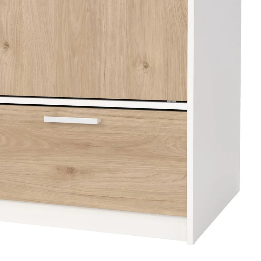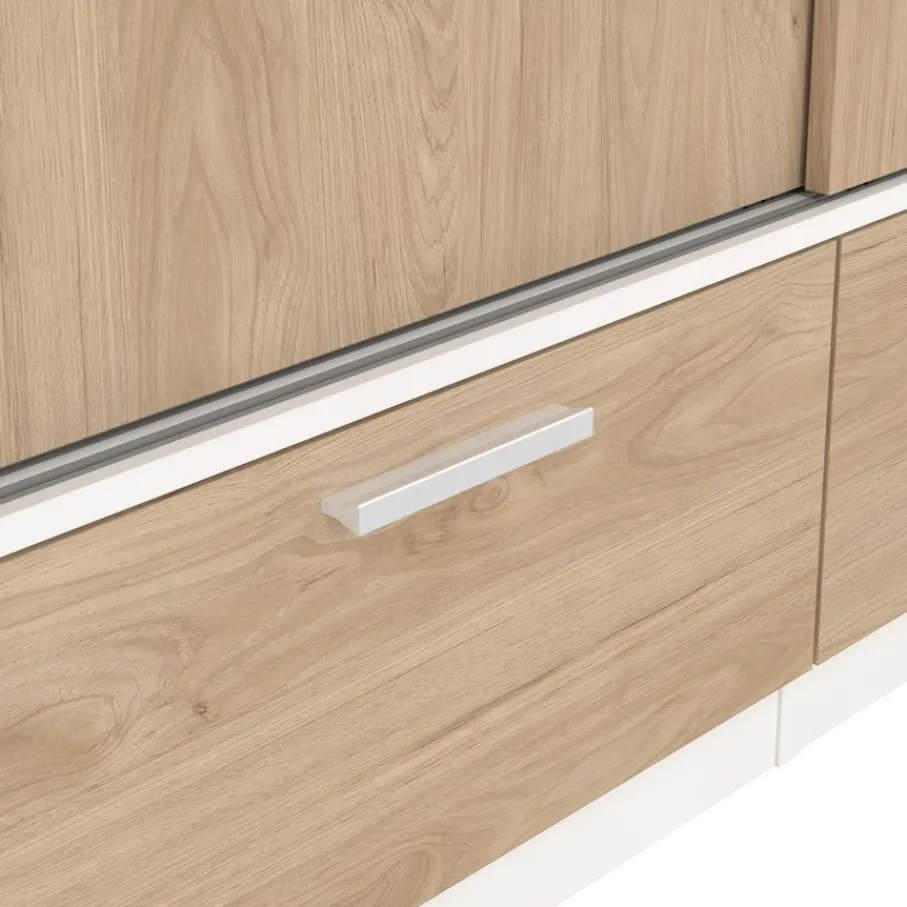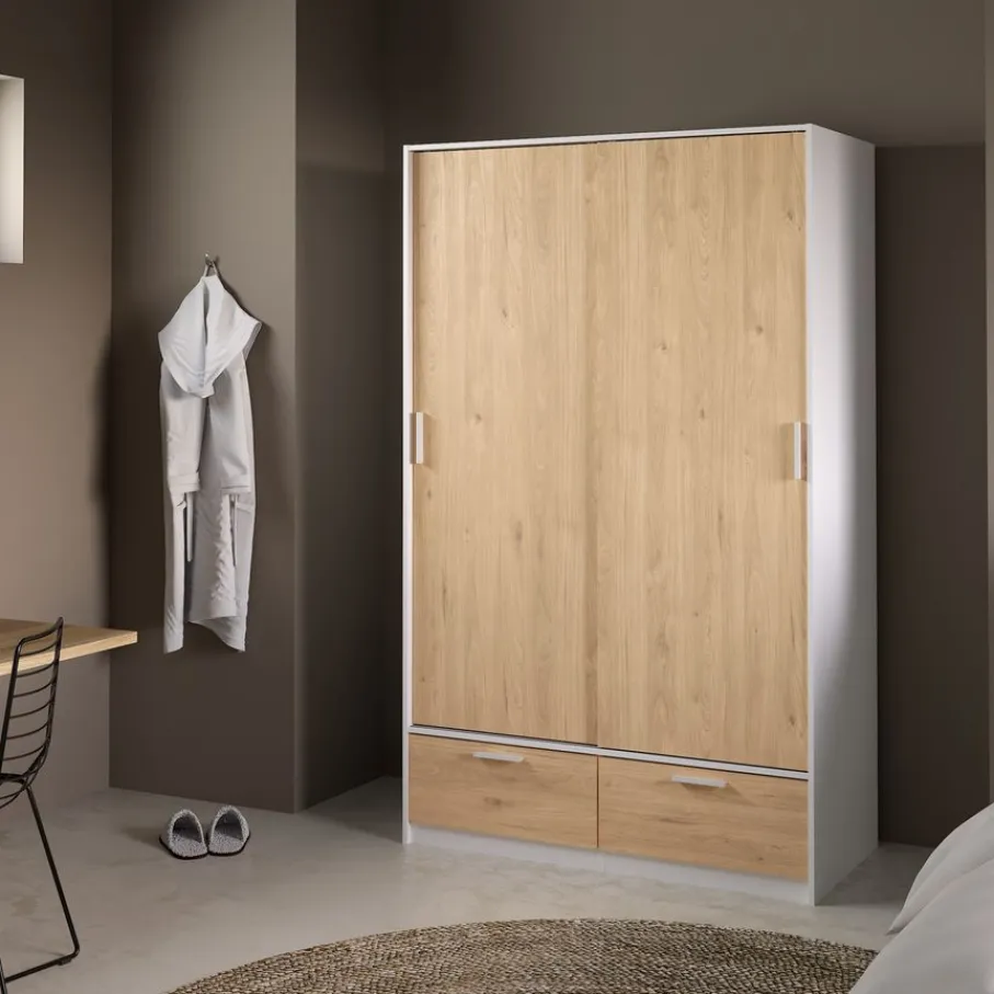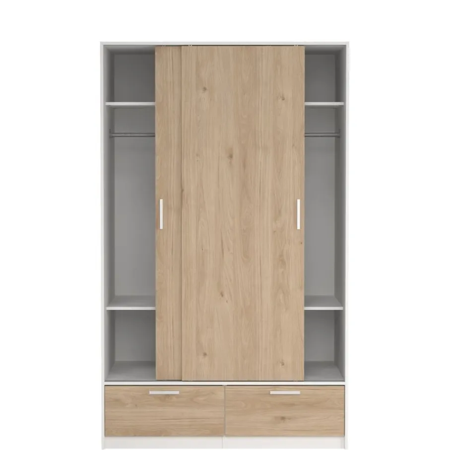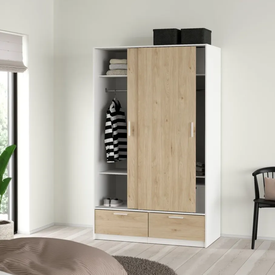 - Geef je slaapkamer een frisse en moderne uitstraling met deze prachtige kledingkast die licht en warmte samenbrengt dankzij de combinatie van wit en houtlook.