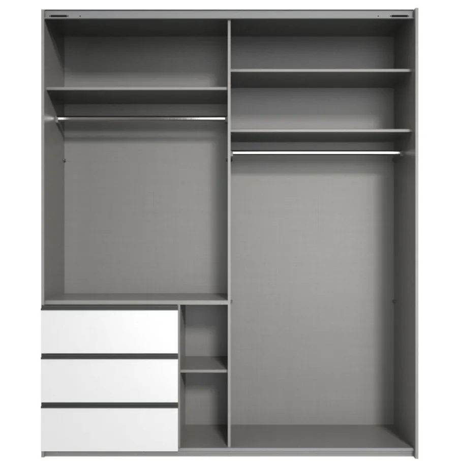 Aan de linkerkant van de kast zitten 3 laden, handig voor sokken en ondergoed. De kast heeft 2 kast gedeelten van 100 cm breed. Het vak aan de linkerkant heeft een plank en een roede. Het vak aan de rechterkant heeft 2 planken en een roede. Om de kast verder in te richten kun je kiezen uit diverse bijpassende Oss kastaccessoires zoals extra legplanken, een kledinglift en verlichting.