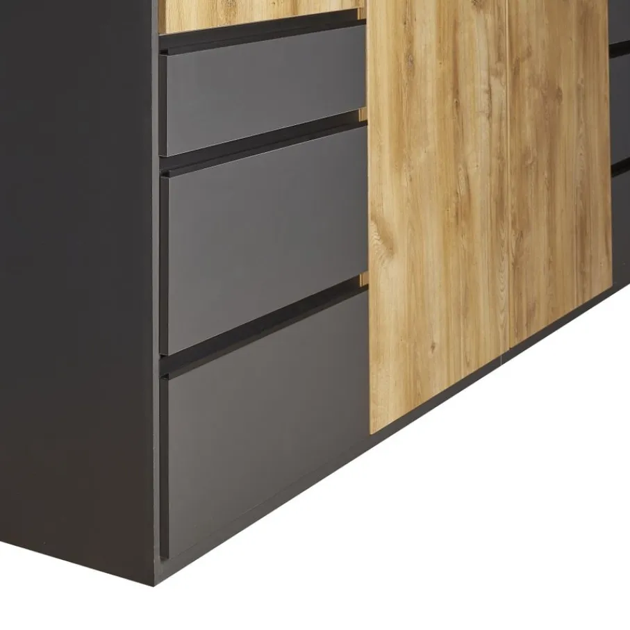 - Geeft je slaapkamer direct een stoere, industriële of landelijke sfeer met zijn robuuste look van grafietgrijs en warme houtlook.