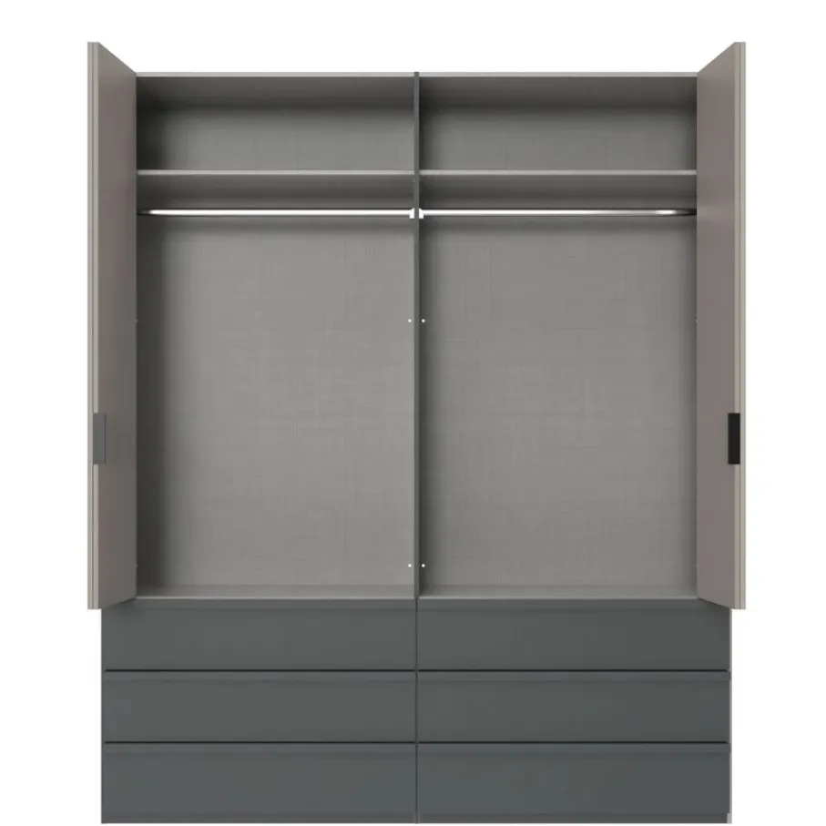 Kledingkast Rivas heeft handige vouwdeuren, waarmee je eenvoudig toegang hebt tot je garderobe. Binnenin vind je twee legplanken en twee roedes om je kleding perfect te organiseren. Aan de onderkant van de kast zitten 6 lades met veel handige opbergruimte.