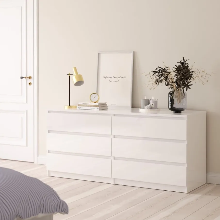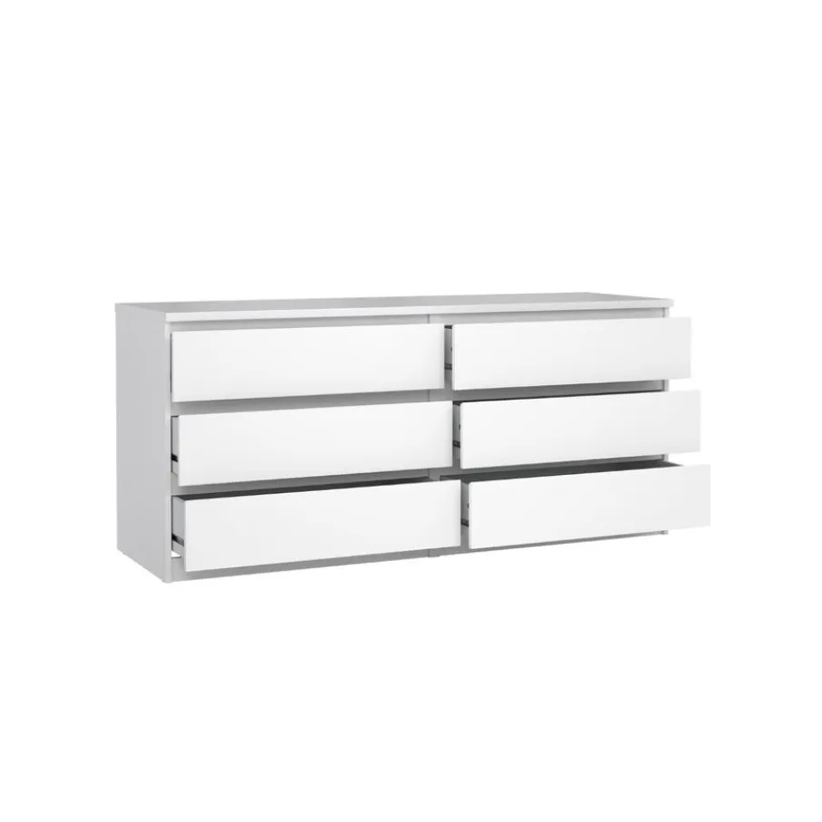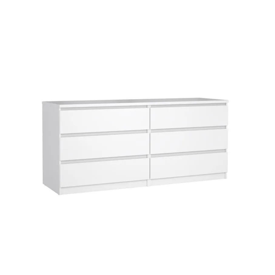 Deze ladekast heeft 6 ruime lades, perfect om van alles en nog wat netjes op te bergen. Ze hebben aan afmeting van 70×43 cm en zijn 12 cm diep. De greeploze lades lopen op metalen geleiders, zodat ze soepel openen en sluiten.