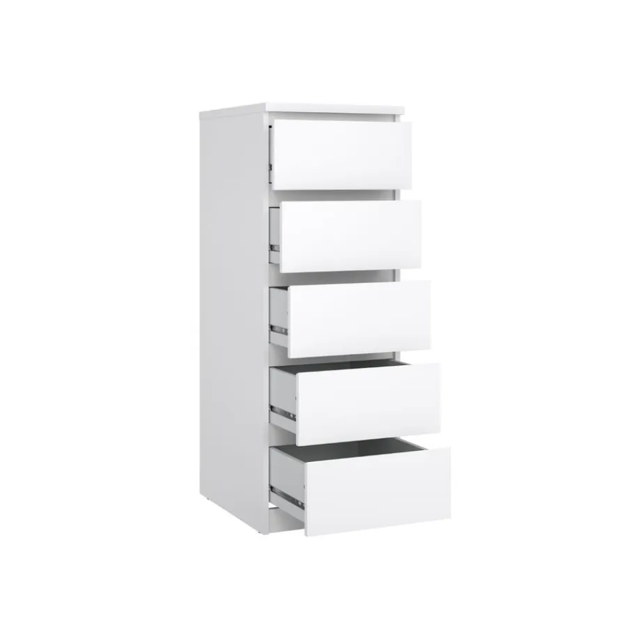 Deze hoge ladekast heeft 5 lades, perfect om van alles en nog wat netjes op te bergen. Ze hebben aan afmeting van 34×43 cm en zijn 12 cm diep. De greeploze lades lopen op metalen geleiders, zodat ze soepel openen en sluiten.