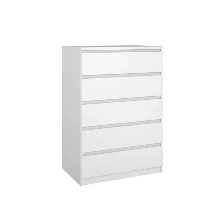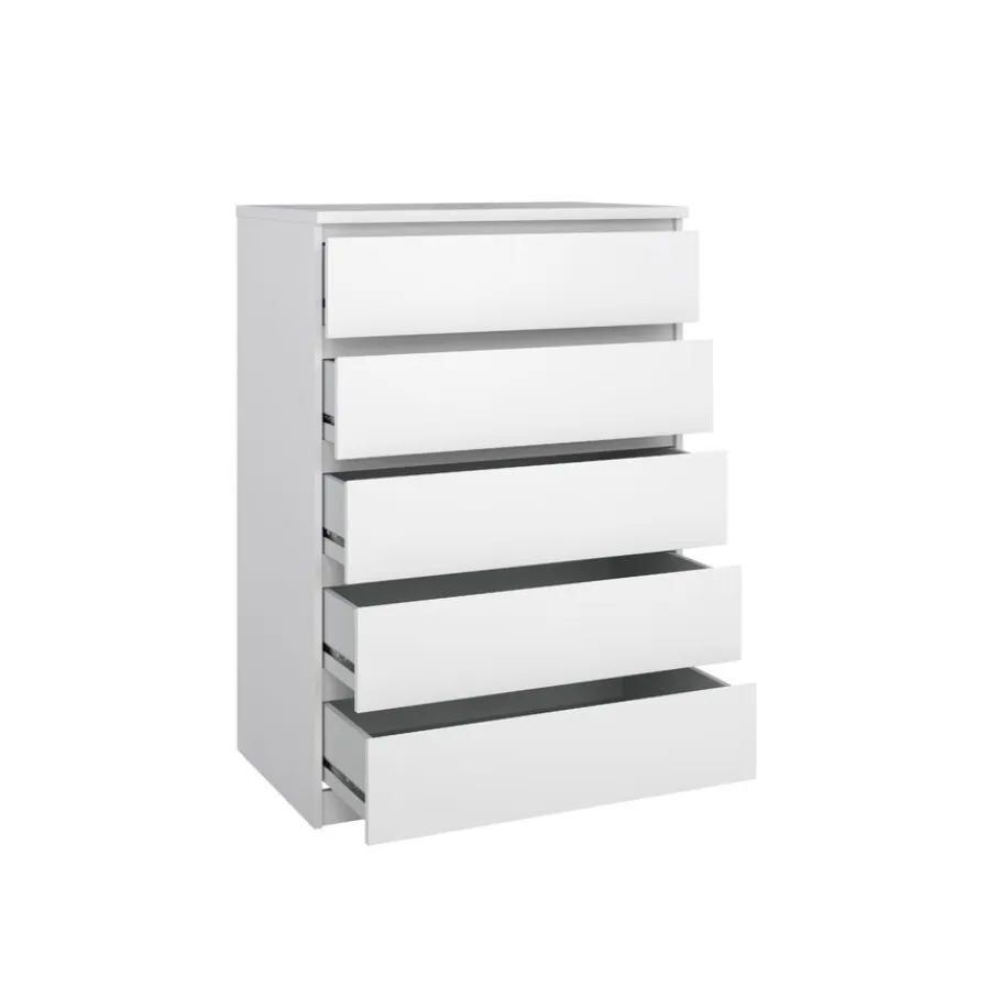 Deze ladekast heeft vijf ruime lades, perfect om van alles en nog wat netjes op te bergen. Ze hebben aan afmeting van 70×43 cm en zijn 12 cm diep. De greeploze lades lopen op metalen geleiders, zodat ze soepel openen en sluiten.