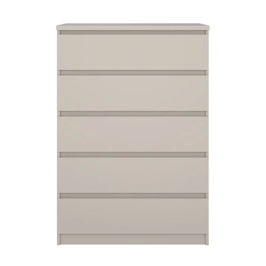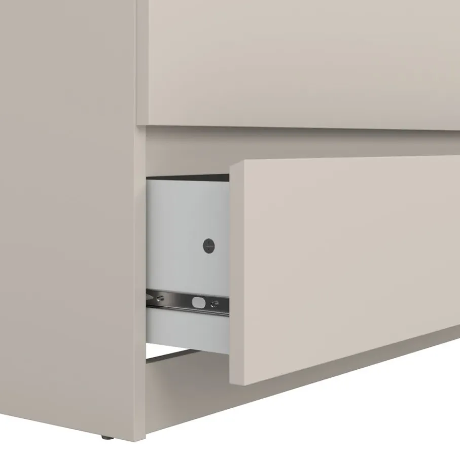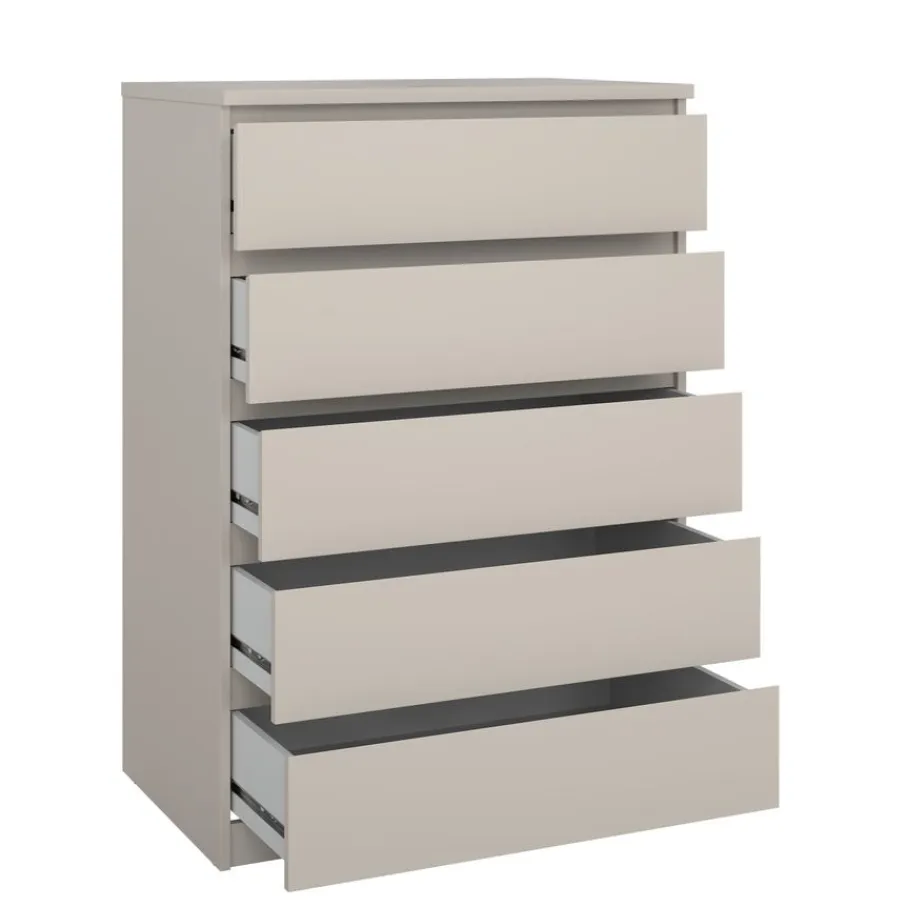 Deze ladekast heeft vijf ruime lades, perfect om van alles en nog wat netjes op te bergen. Ze hebben aan afmeting van 70×43 cm en zijn 12 cm diep. De greeploze lades lopen op metalen geleiders, zodat ze soepel openen en sluiten.