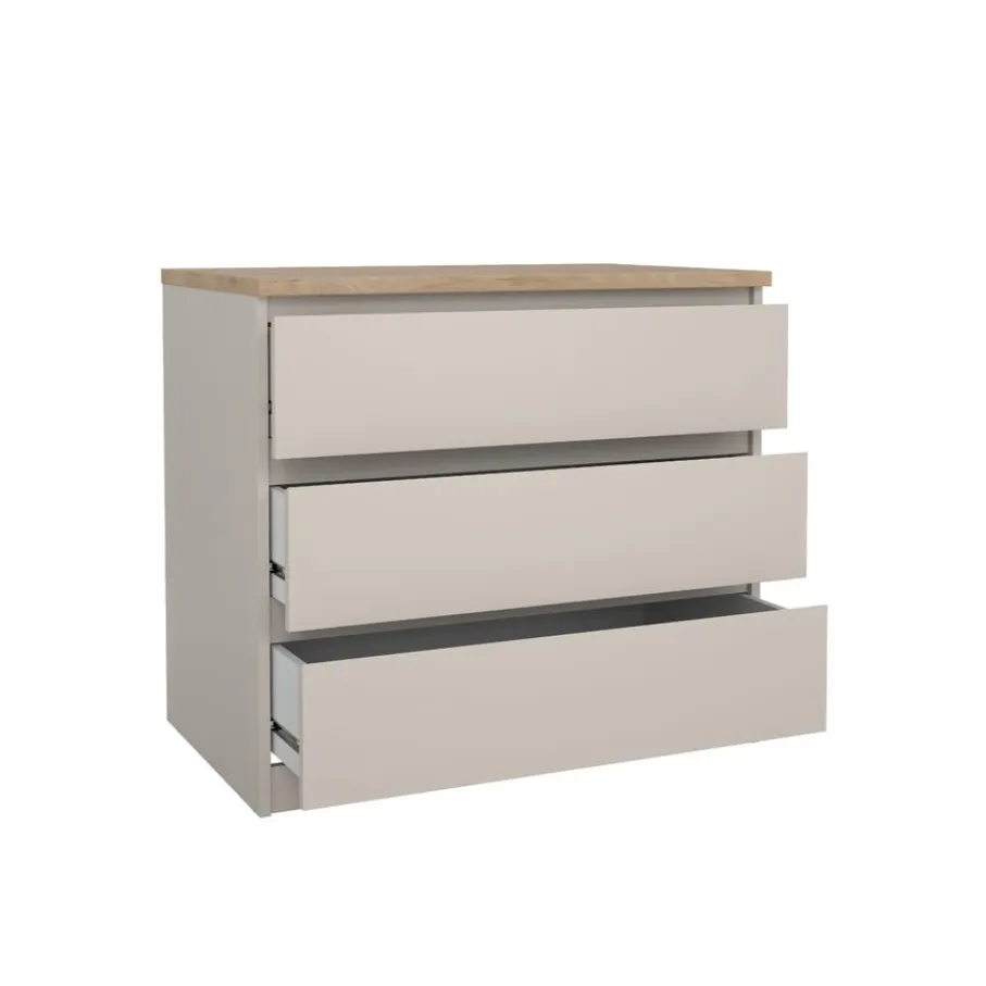 Deze ladekast heeft 3 ruime lades, perfect om van alles en nog wat netjes op te bergen. Ze hebben aan afmeting van 70×43 cm en zijn 12 cm diep. De greeploze lades lopen op metalen geleiders, zodat ze soepel openen en sluiten.