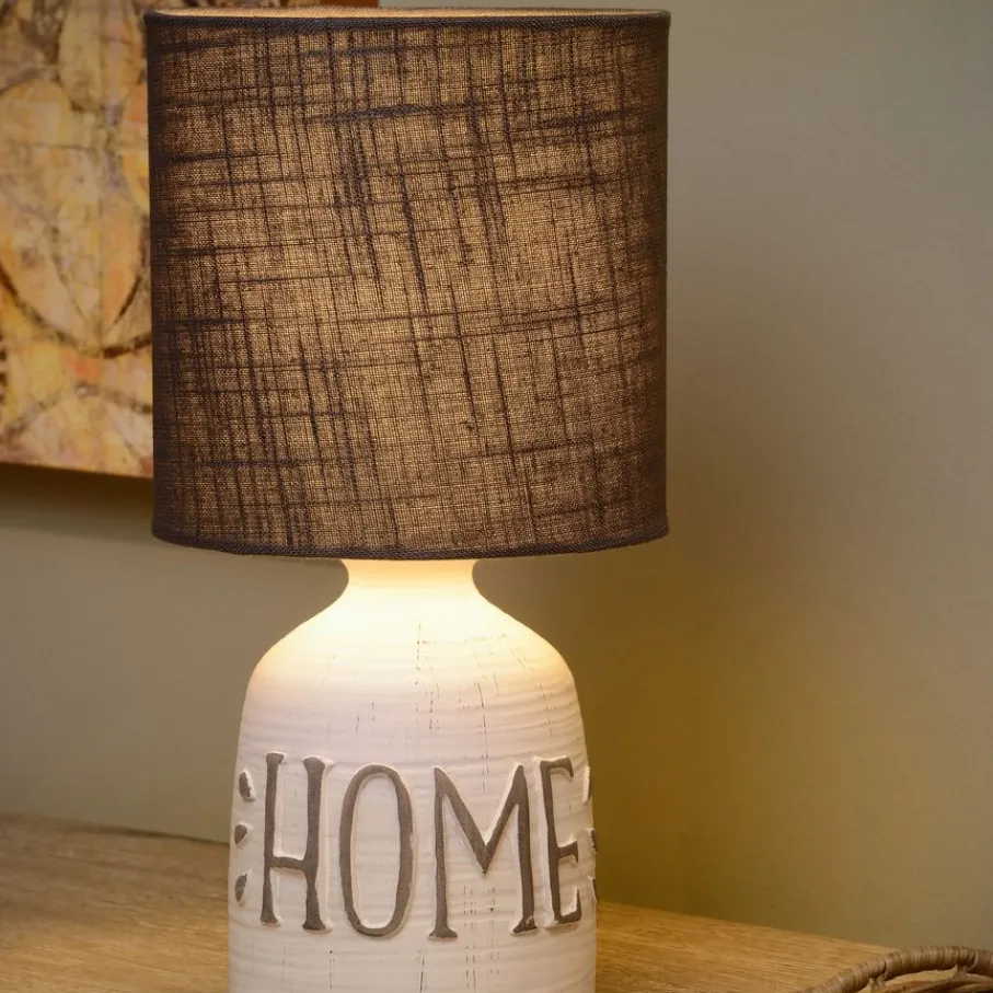 - Breng direct landelijke sfeer in huis: Met zijn charmante witte keramieken voet en de tekst ‘HOME’ voegt deze lamp direct een gezellige, huiselijke touch toe aan elke ruimte.