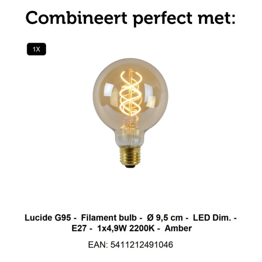 In de lamp gaat een gloeilamp met een grote fitting type E27 van maximaal 40 watt. Deze wordt niet meegeleverd. Om je lamp compleet te maken, vergeet dan niet om er de juiste lichtbron bij aan te schaffen.