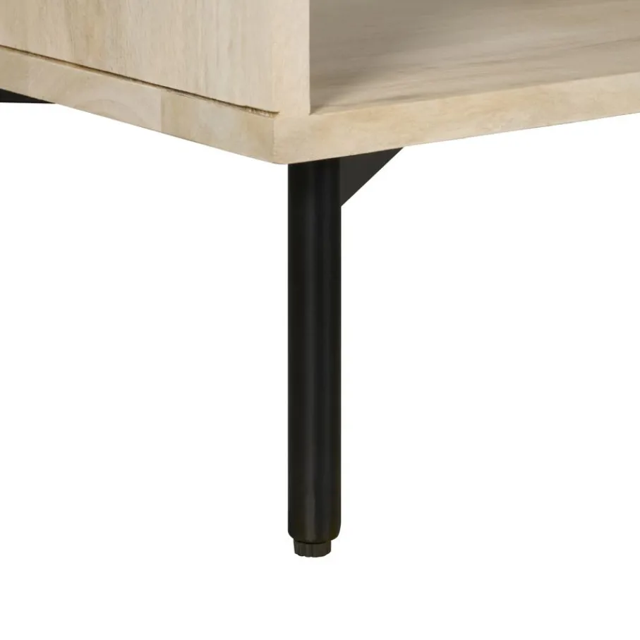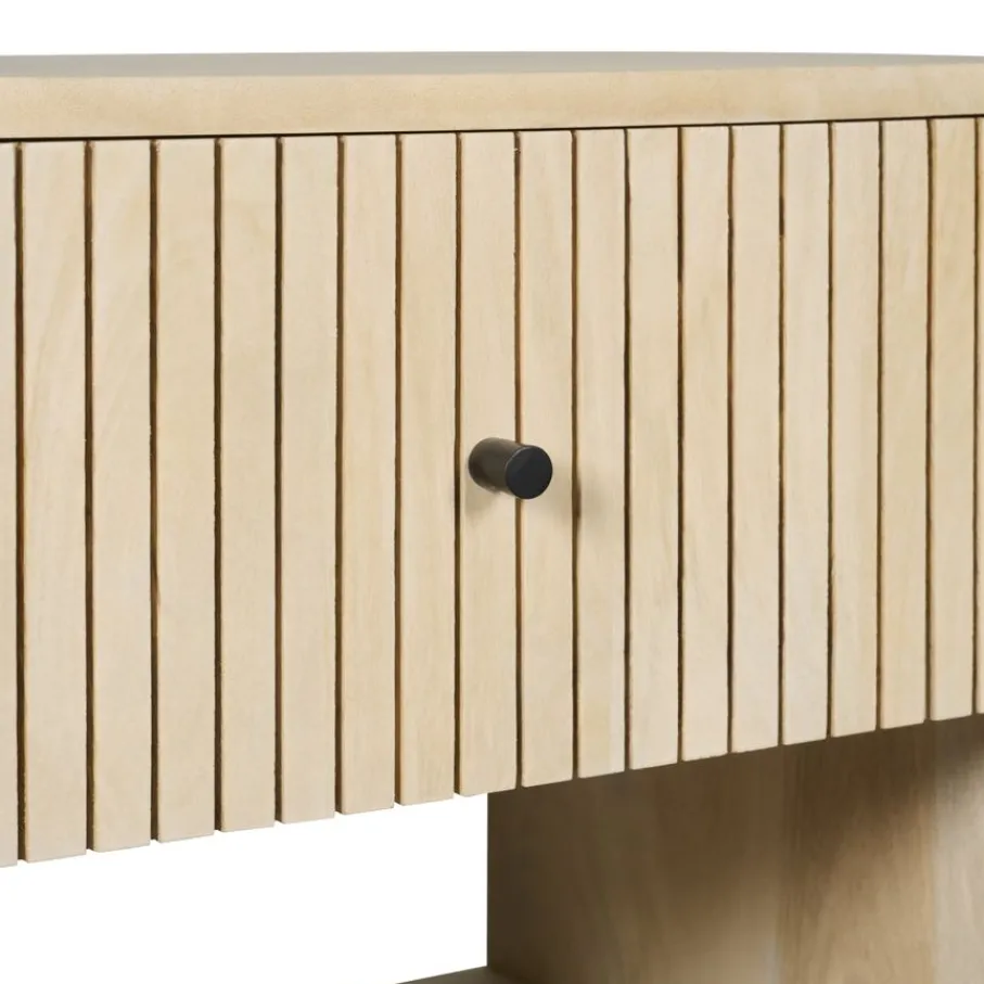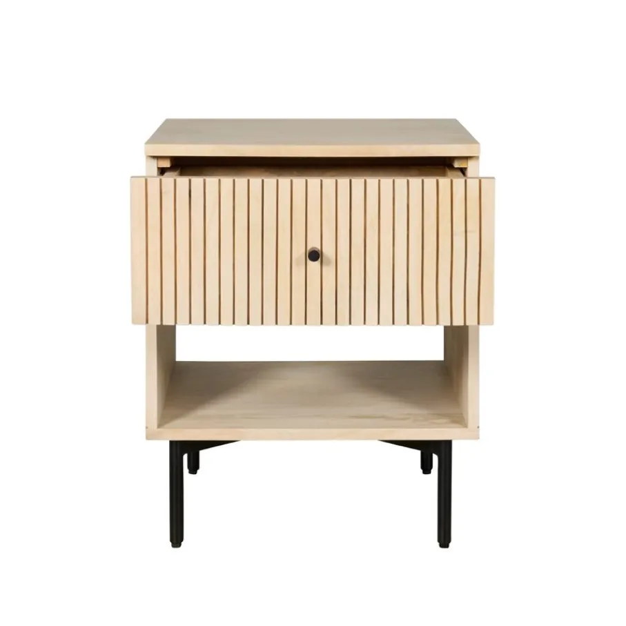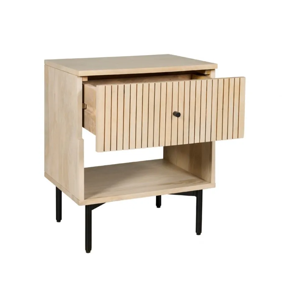 - Een unieke blikvanger: Dit nachtkastje heeft een prachtige, lichte finish van mangohout en een speels lijnenspel op de lade, een echt design statement voor je huis.