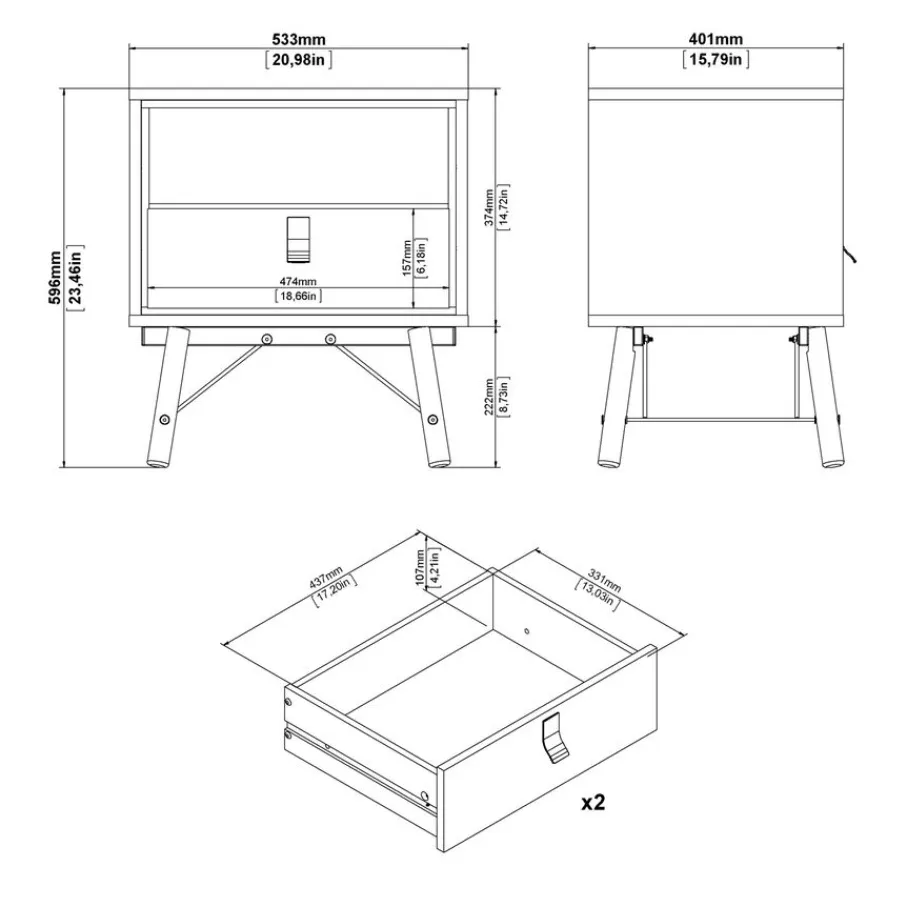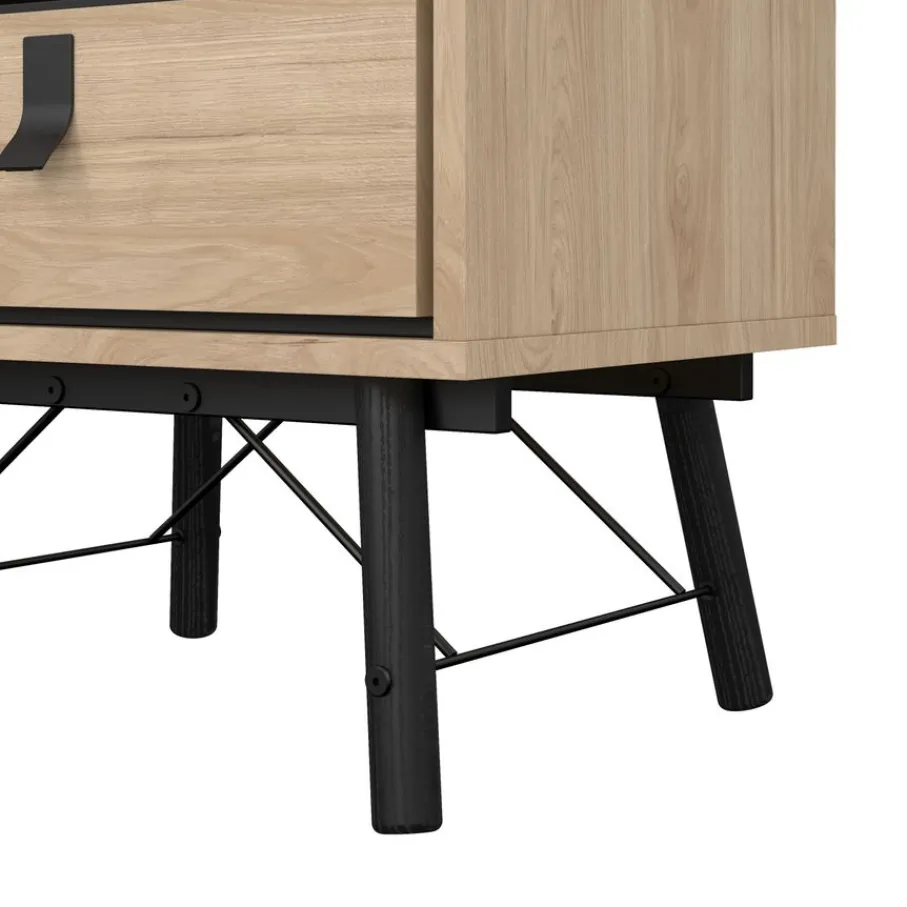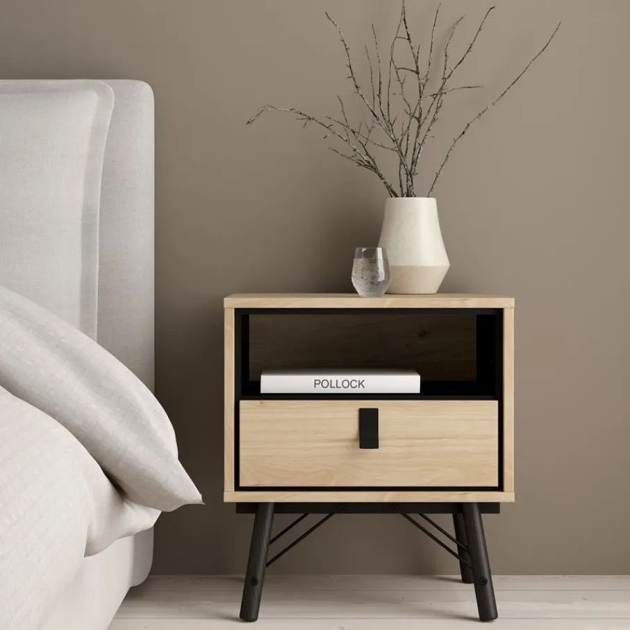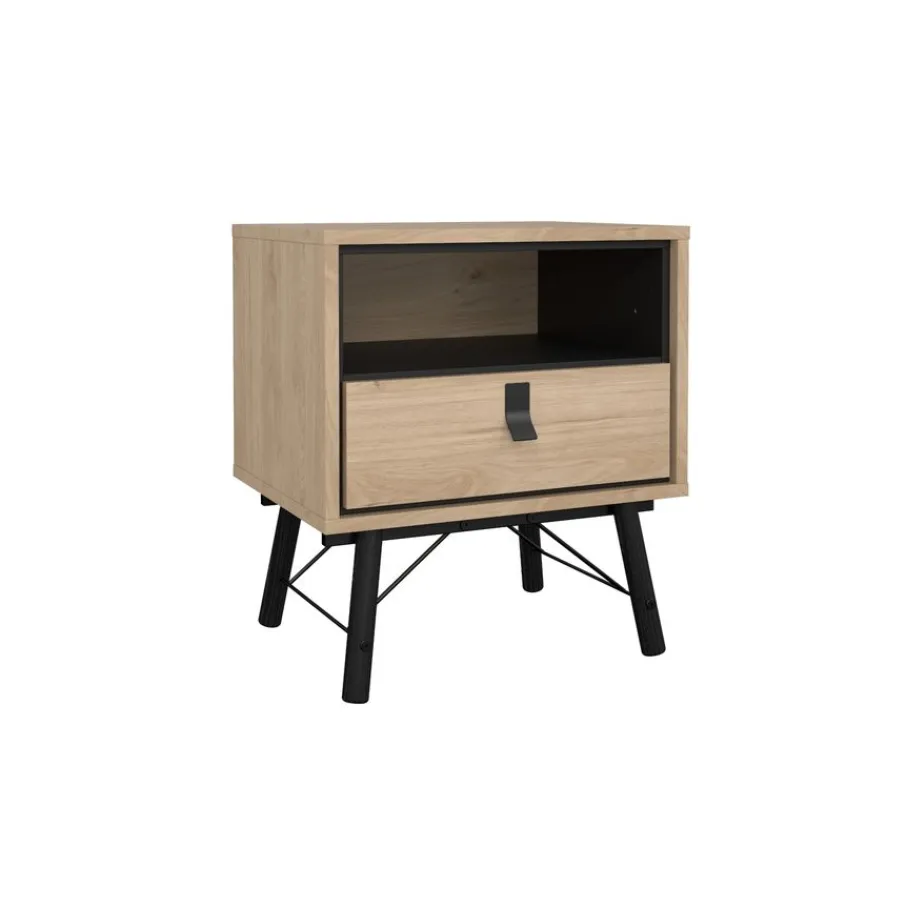 Het nachtkastje heeft bovenin een open vak, met daaronder een lade. Het biedt praktische opbergruimte voor alles wat je dichtbij je bed wilt hebben. De lade heeft een speelse vorm handgreep van zwart metaal.