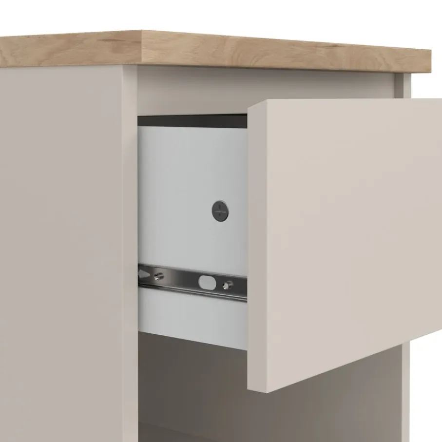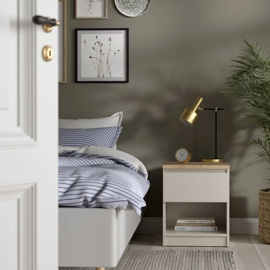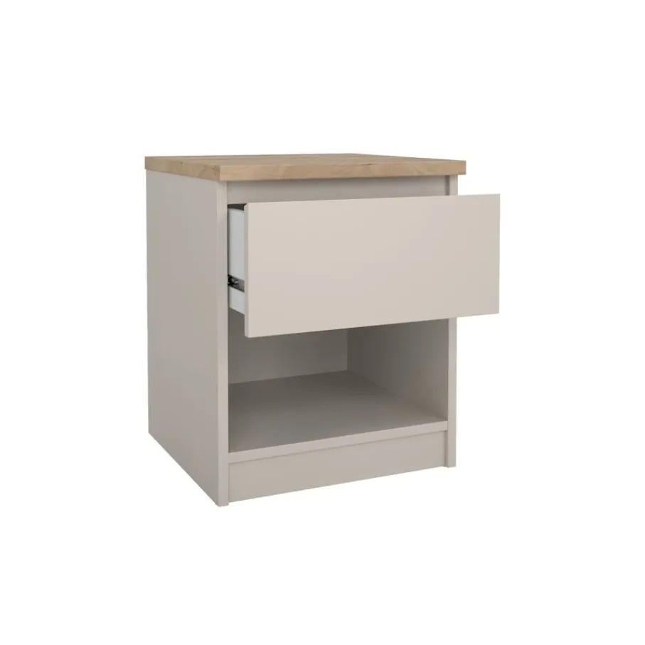 Met een compact formaat en praktische opbergmogelijkheden past nachtkastje Luna moeiteloos naast elk bed. Dit kastje combineert een handige lade met een open vak. De lade opent soepel door de kogel gelagerde geleiders en het open gedeelte is perfect voor je favoriete boeken of accessoires.