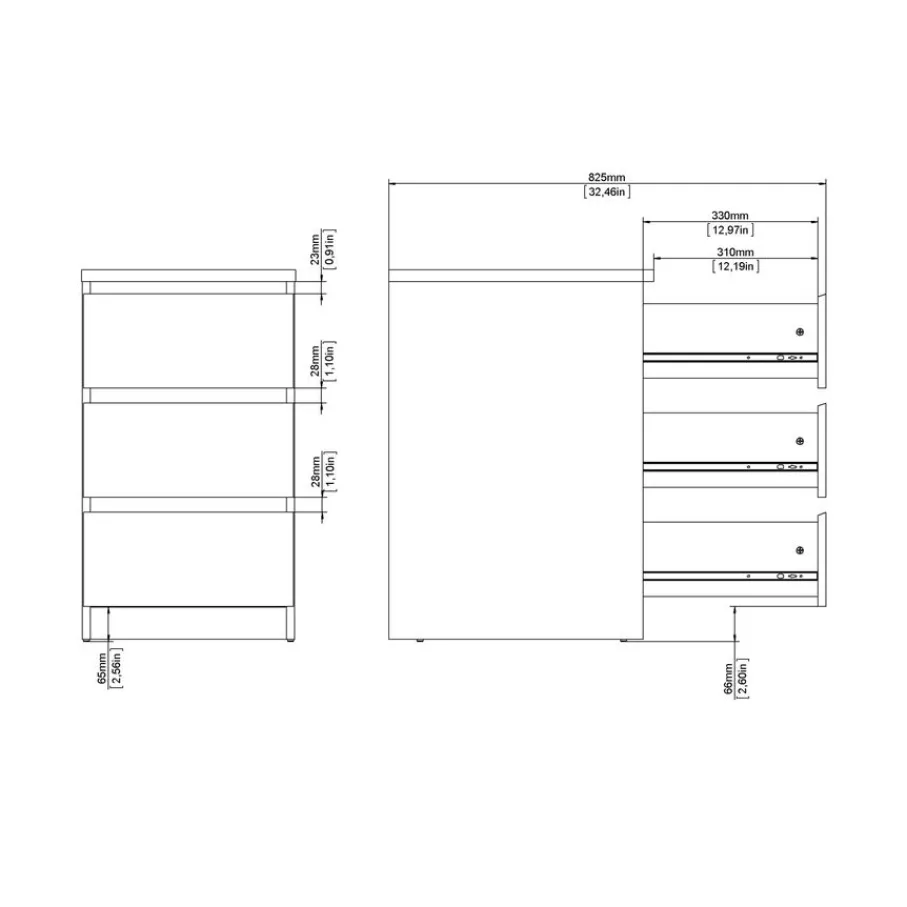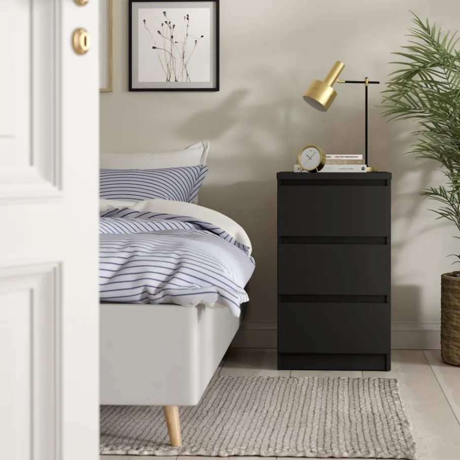 Dit nachtkastje heeft 3 lades, perfect om van alles en nog wat netjes op te bergen. Ze hebben aan afmeting van 34×43 cm en zijn 12 cm diep. De greeploze lades lopen op metalen geleiders, zodat ze soepel openen en sluiten.