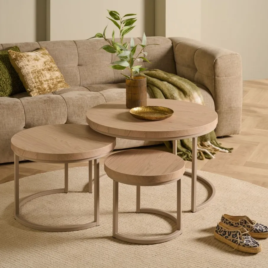 - Speel met de ruimte: Deze set van drie ronde tafels in verschillende hoogtes biedt je eindeloze mogelijkheden om jouw zithoek steeds weer opnieuw in te richten en te stylen.
