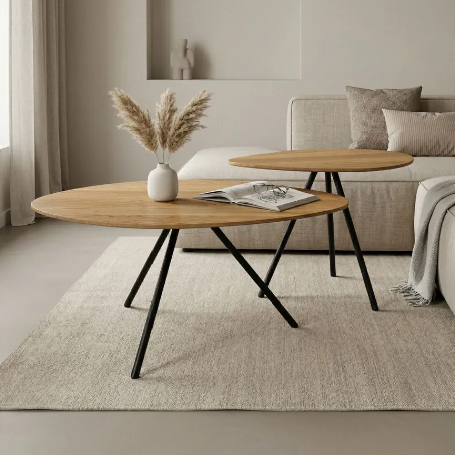 Salontafel set Varo combineert moeiteloos een modern design met natuurlijke charme. De eikenhouten bladen hebben een warme, naturelle kleur die perfect samengaat met de strakke, zwart metalen poten. De organische vormen zorgen voor een speelse en moderne sfeer in jouw living. Je kunt de tafels samen gebruiken voor een gelaagd effect, of ze apart plaatsen voor extra flexibiliteit en functionaliteit. De Varo salontafel set is een elegante musthave in ieder modern interieur.