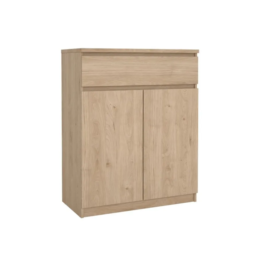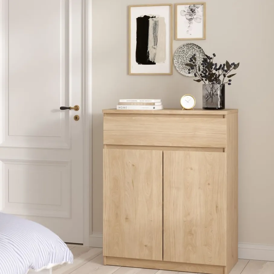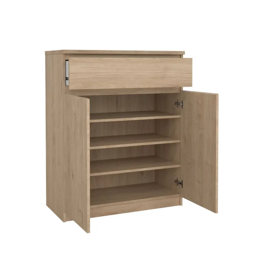 De Luna schoenenkast heeft een ruim vak met drie planken. Daarboven zit, over de hele breedte, een lade op soepele geleiders.