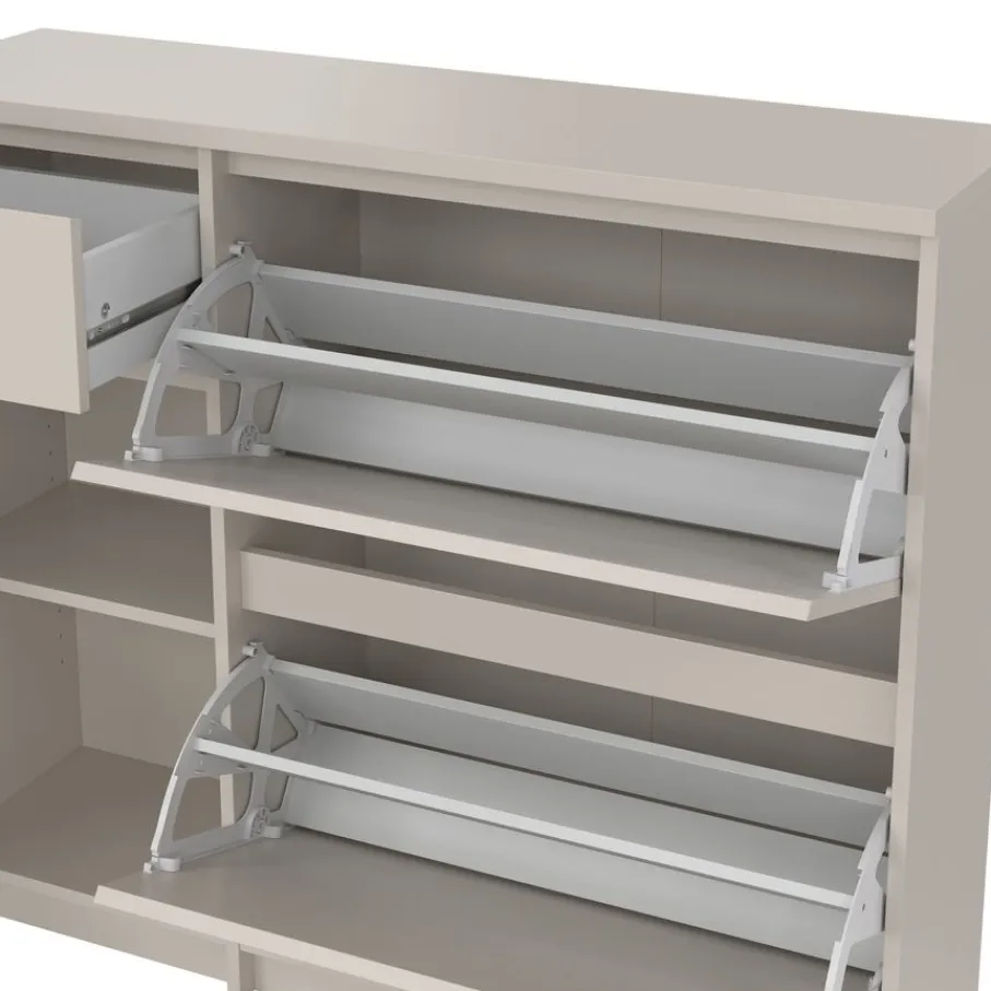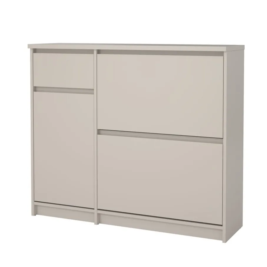 De Luna opbergkast heeft aan de linkerkant een lade met daaronder een vak met een draaideur. In dit vak zit een plank die zorgt voor vakverdeling. Rechts zijn er twee kleppen boven elkaar, met plaats voor meerdere paren schoenen schoenen.