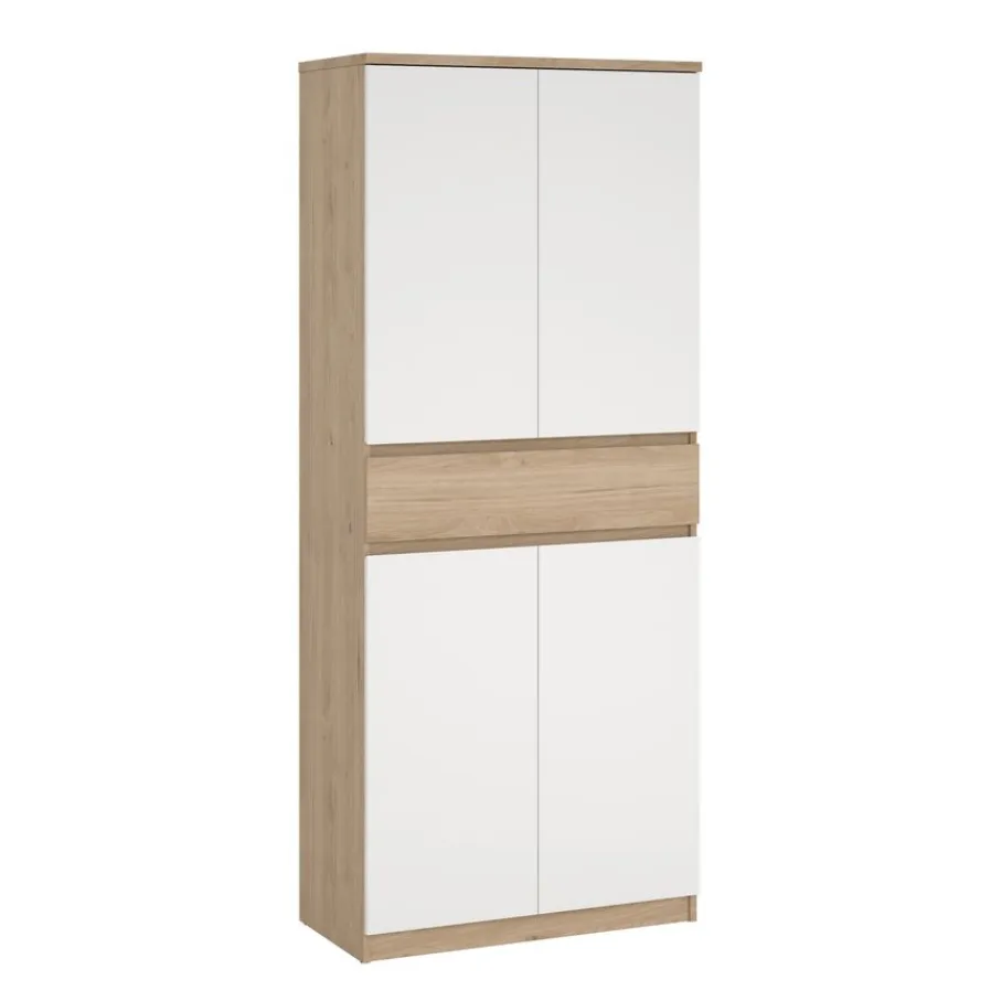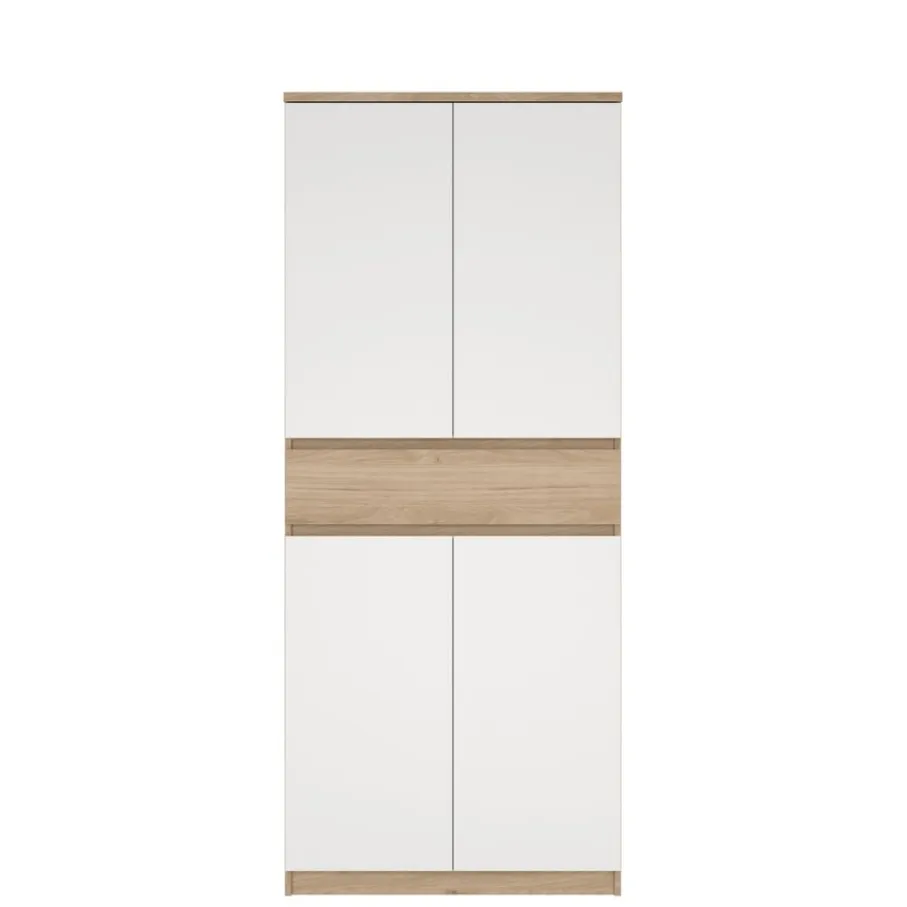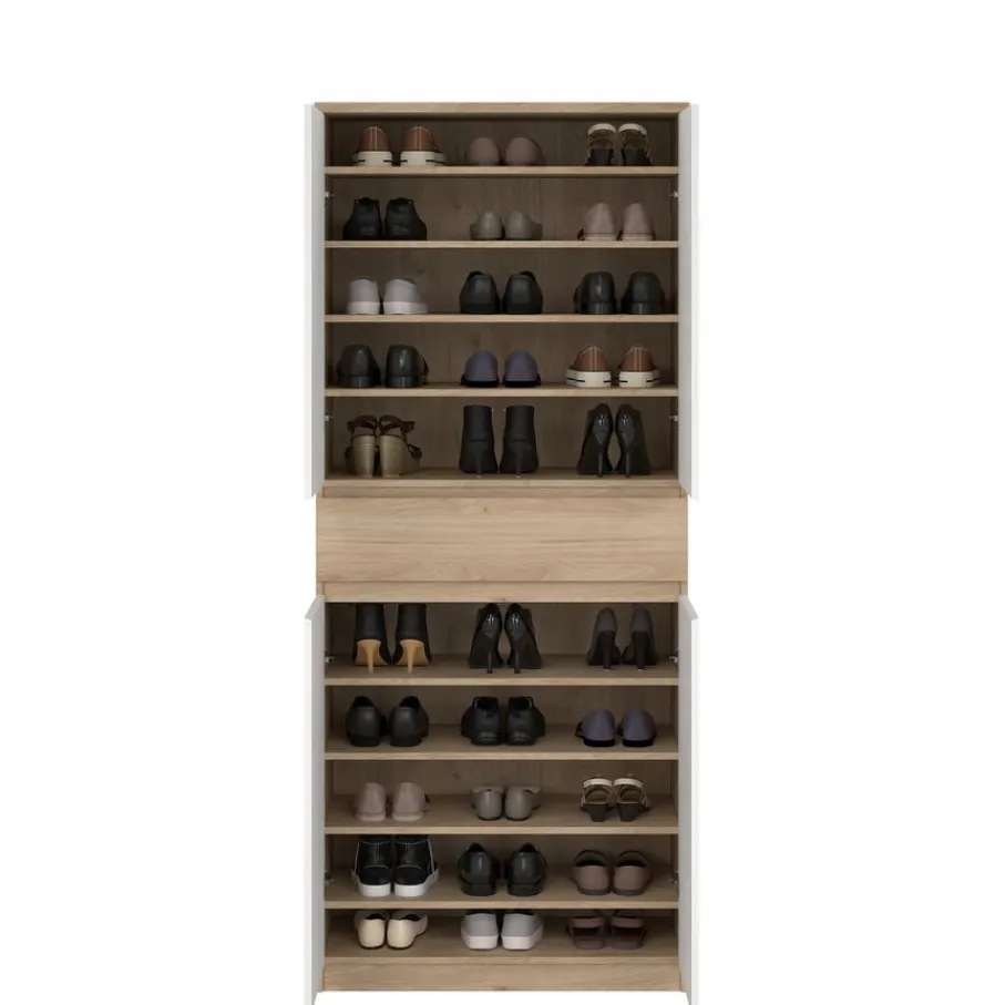 Schoenenkast Luna met twee deuren en handige lade biedt praktische opberg mogelijkheden. Boven en onder de lade zit een ruim vak met plek voor schoenen en dergelijke. Elk vak heeft er één vaste en drie verstelbare legplanken in. De kast wordt dus geleverd inclusief 8 planken.