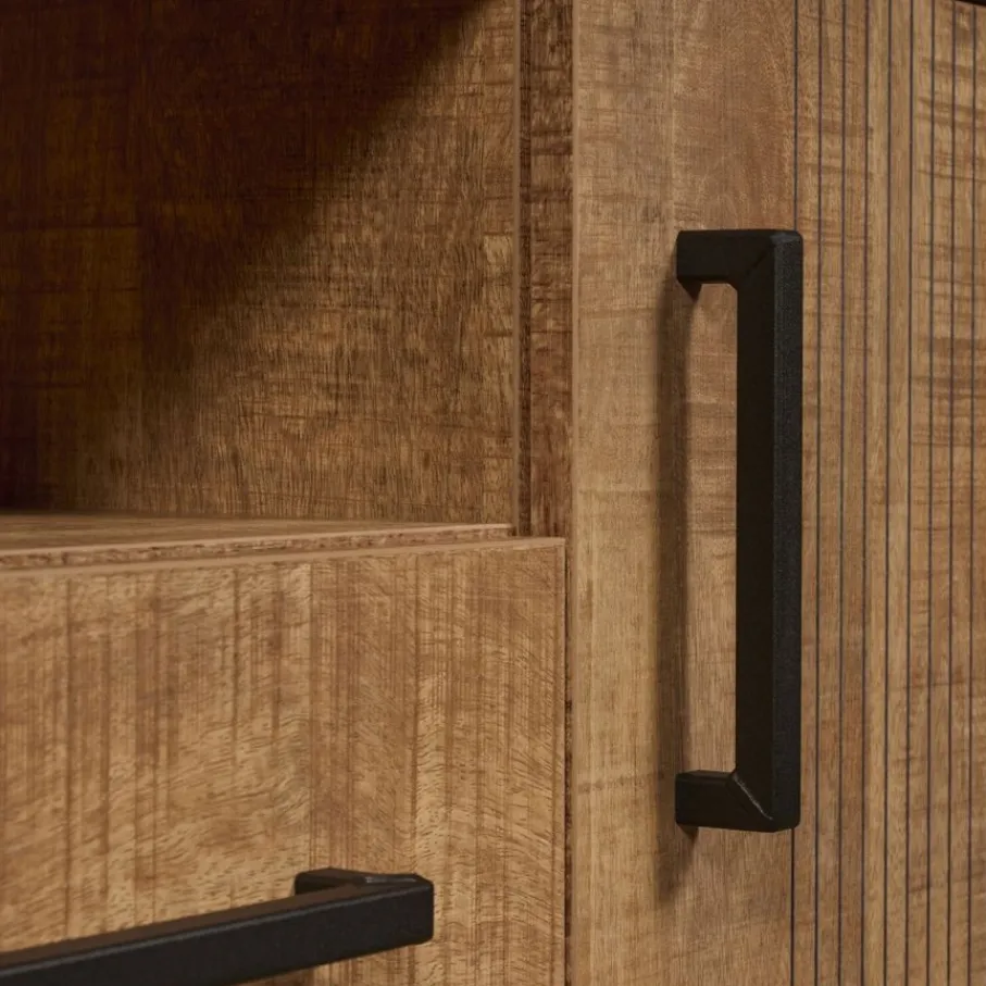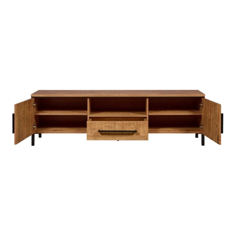 Het tv meubel heeft links en rechts een vak met een deur ervoor. In het midden zit een open vak met een lade eronder. De deuren en lade zijn voorzien van softclose, hierdoor sluiten ze zacht en soepel. Ze hebben zwart metalen handgrepen.