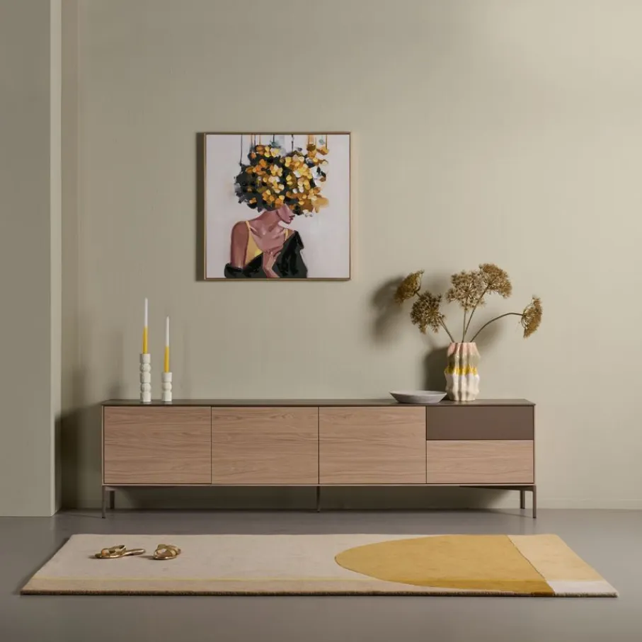 - Creëer een open en luchtige sfeer in huis; de kubistische body in houtlook staat elegant op de hoge, ranke metalen poten.