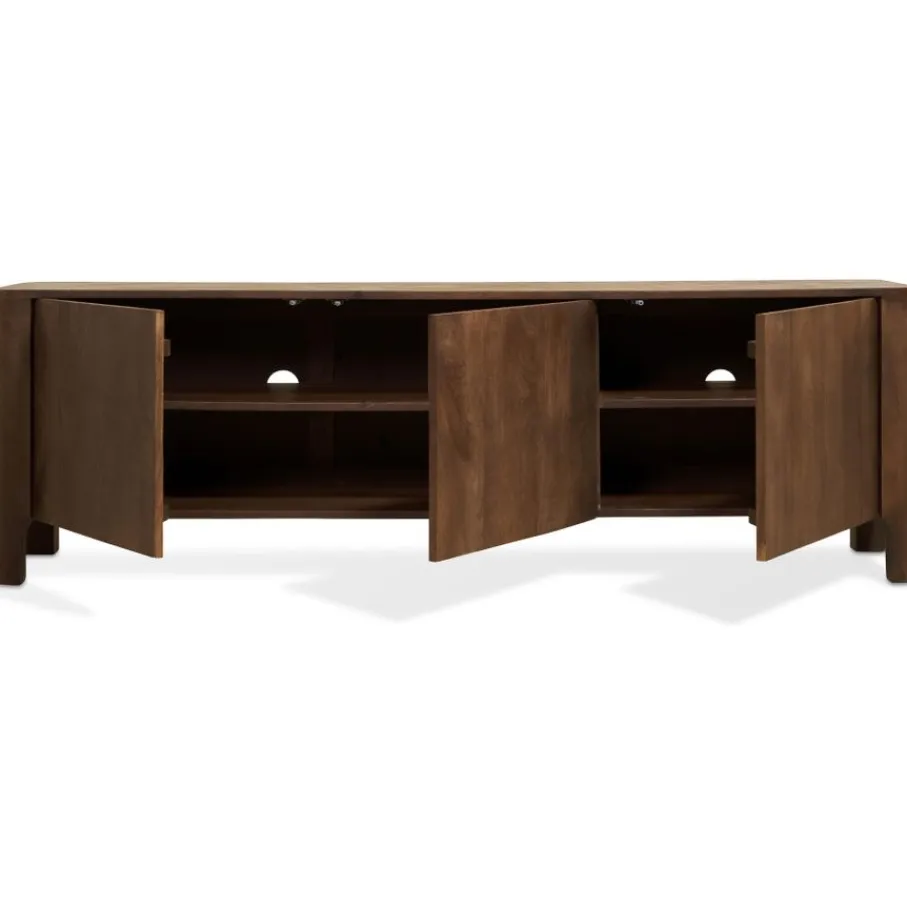 Achter de vier deuren vind je volop opbergruimte, netjes verdeeld over legplanken. Handig voor audio apparatuur, of wat je maar uit het zicht wilt opbergen. Aan de achterkant zijn 2 uitsparingen om snoeren door te geleiden.