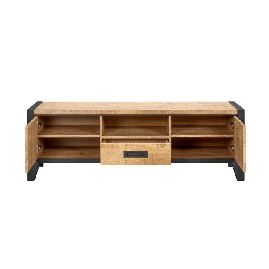 - Geef je woonkamer direct een stijlvolle upgrade met dit robuuste tv-meubel dat door de warme houtlook en het zwarte metaal overal fantastisch staat.