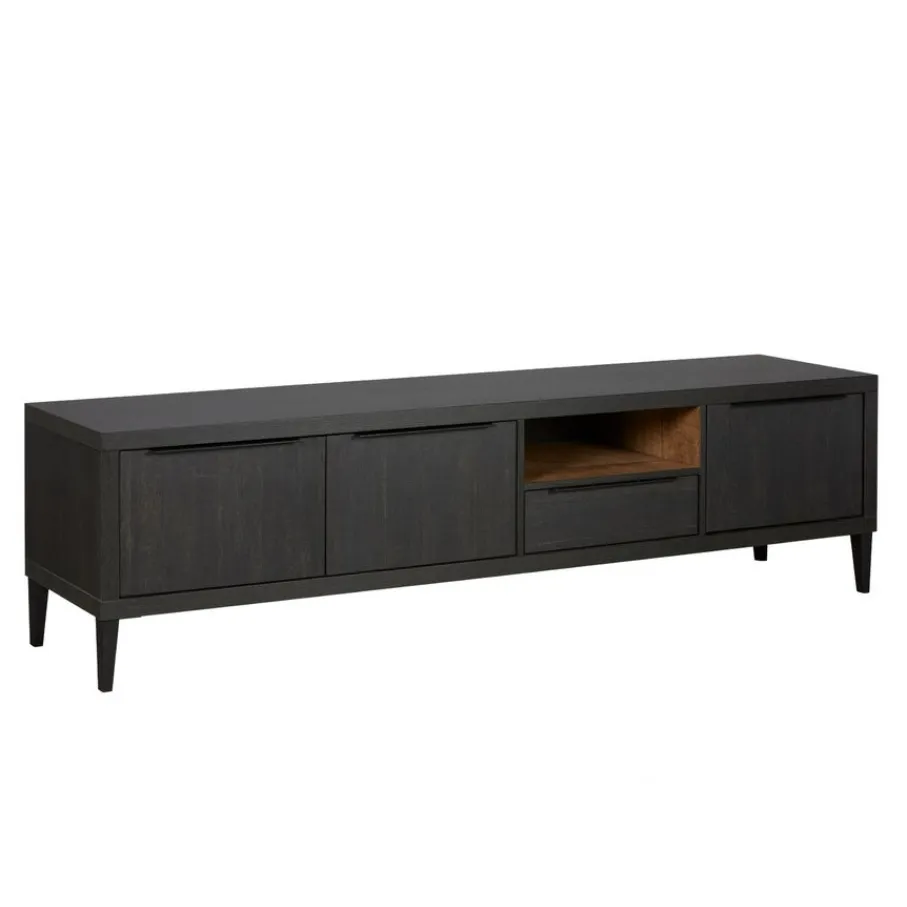 Het tv meubel heeft in totaal 3 deuren. Onder het open vak bevindt zich ook nog een lade. Het open vak heeft aan de achterkant een uitsparing om snoeren doorheen te geleiden. Alle deuren en de lade zijn voorzien van een “soft close” systeem, waardoor ze soepel en geruisloos sluiten.