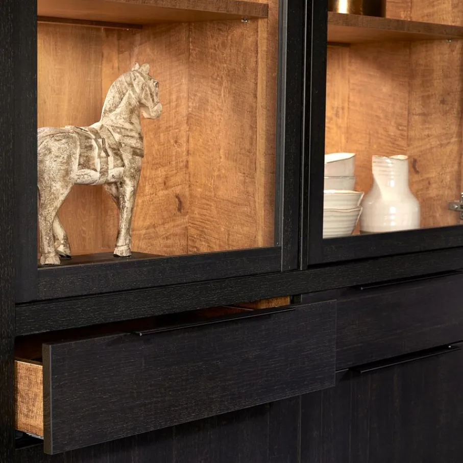 - Combineer show en opbergruimte: in de vitrinegedeelten met sfeervolle kastverlichting laat je jouw mooiste servies of dierbare herinneringen schitteren, terwijl je achter de dichte deuren en in de lades al je andere spullen netjes uit het zicht houdt.