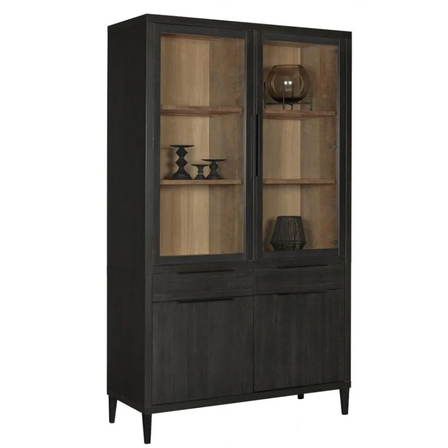 Deze vitrinekast heeft bovenin 2 vitrine gedeelten met kastverlichting. Achter glas is er veel plek voor mooi glaswerk of servies. Verder heeft de kast nog 2 dichte gedeelten en 2 lades. Alle deuren en lades zijn voorzien van soft close. waardoor ze soepel en geruisloos sluiten.