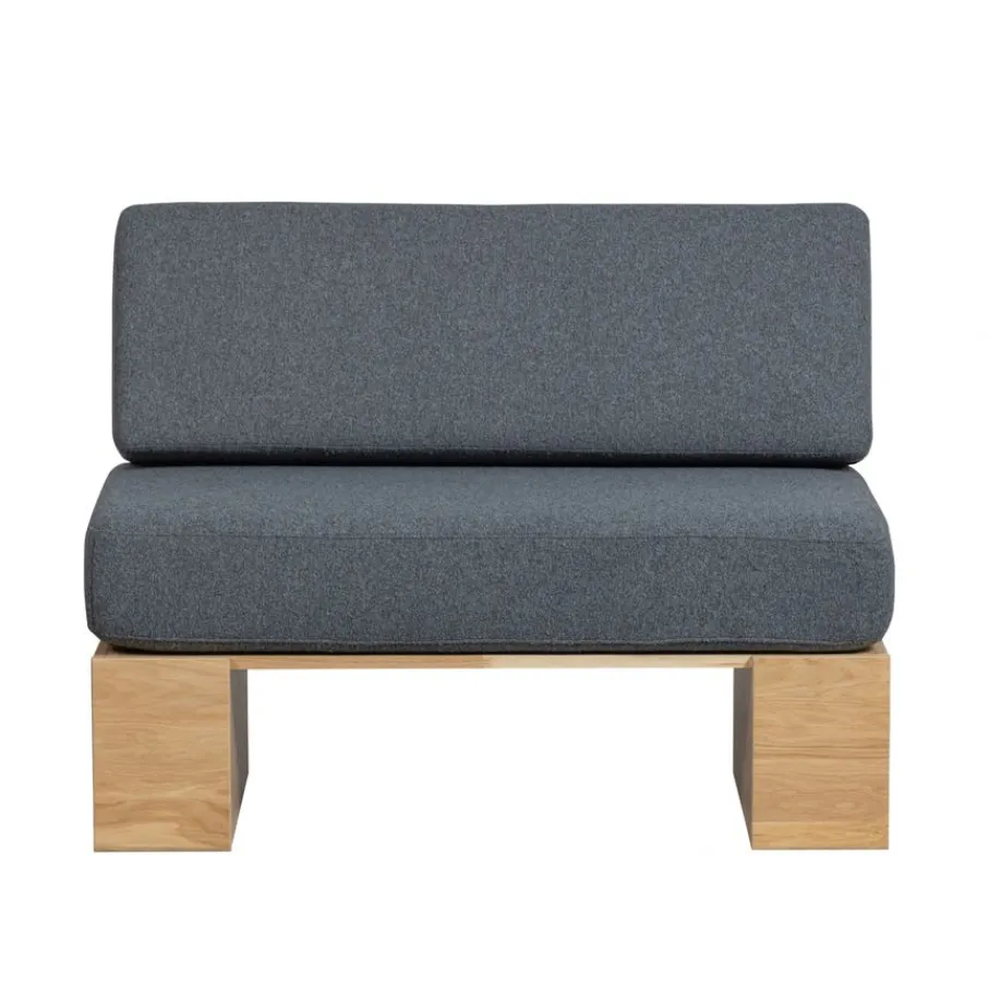 De losse kussen zijn bekleed met een bouclé stof. Deze wollige stof heeft een gelijkmatige denim kleur en een iets viltige grip. Het is gemaakt van 100% Harmolan Polypropyleen, een gerecycled polyester. Met een Martindale van 45.000 is de stof geschikt voor intensief woongebruik en blijft de stoffering goed in vorm.