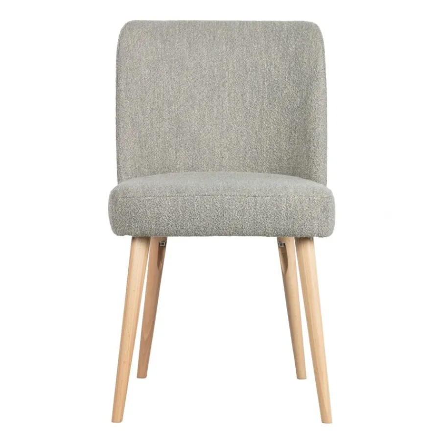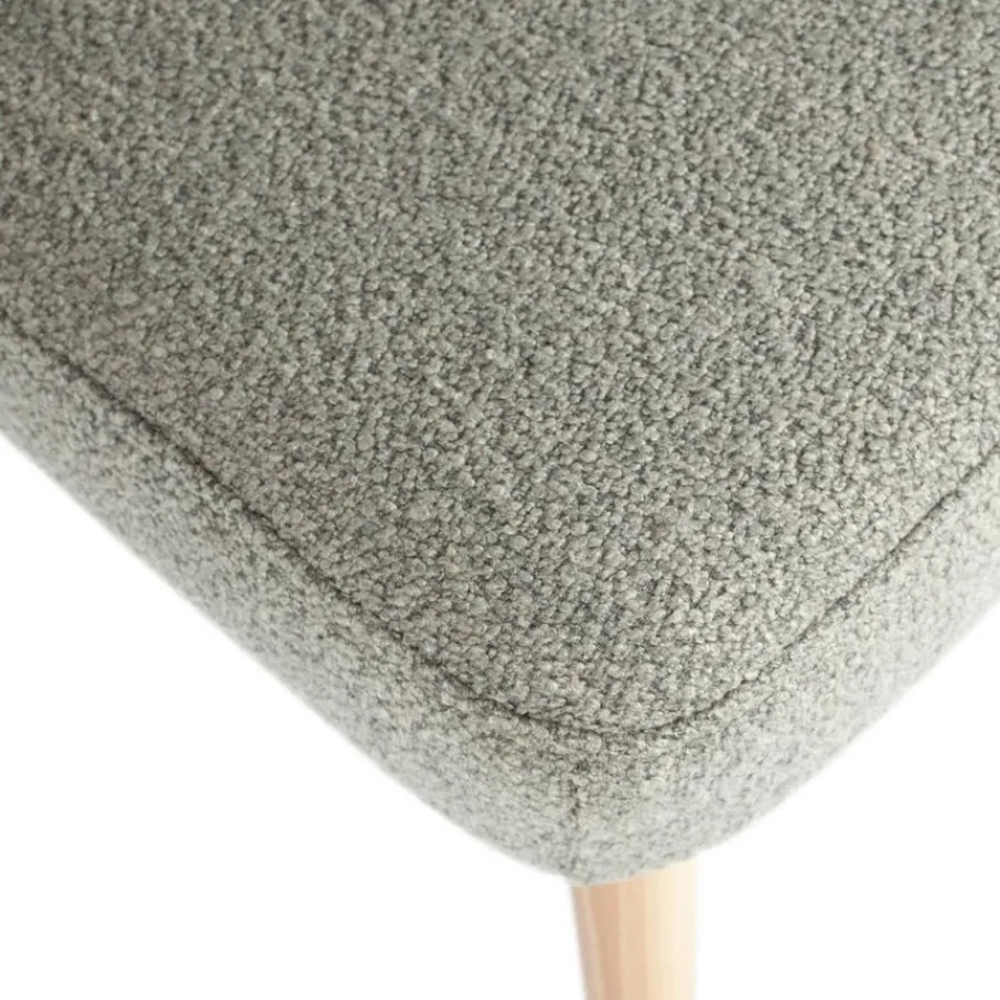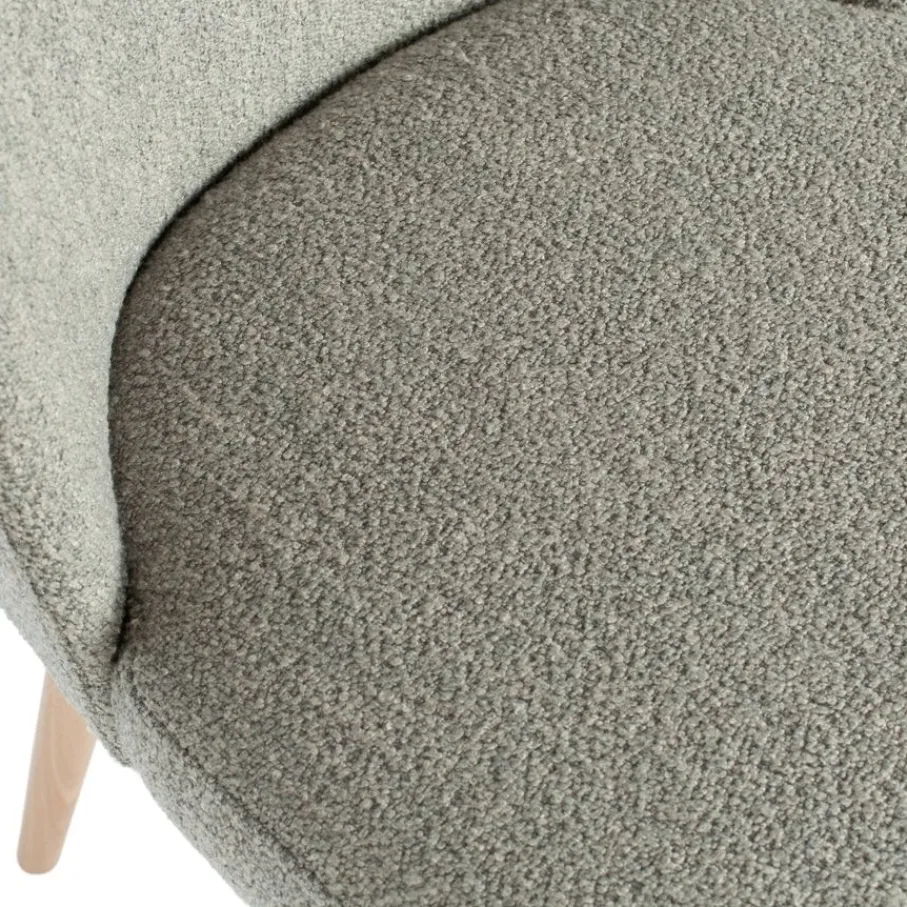- Zachte lichtgrijze bouclé en beukenhouten poten
