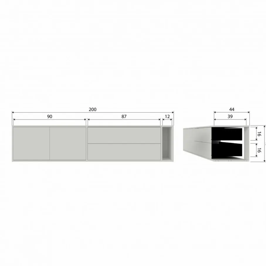 De kast heeft links een vak van 80 cm breed en 40 cm hoog. Er zit een plank in voor vakverdeling en aan de achterzijde zit een gat voor het geleiden van snoeren en kabels. Rechts zitten 2 lades en iedere lade is 80 cm breed en 20 cm hoog. De deuren en lades zijn greeploos en voorzien van een push-to-open systeem. Het maximale draaggewicht van de bovenzijde is 50 kg. Het maximale draaggewicht per plank of lade is 15 kg.