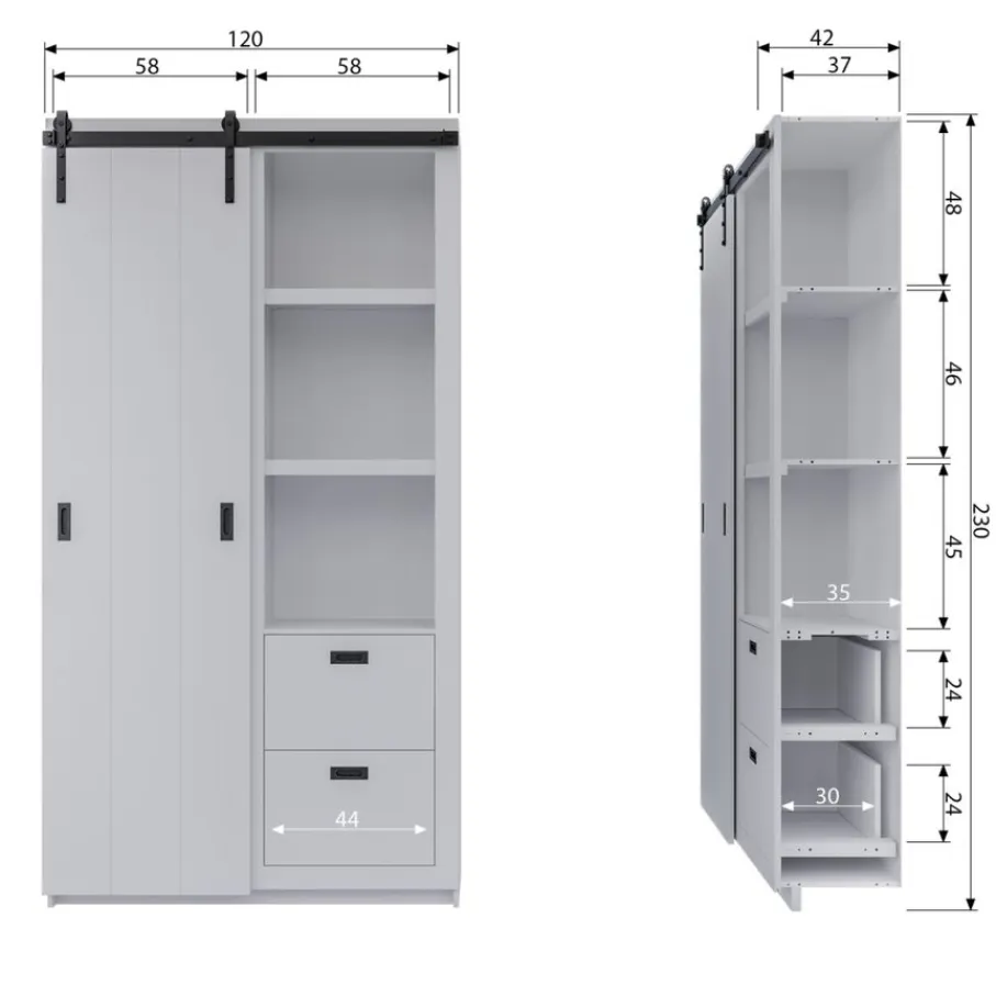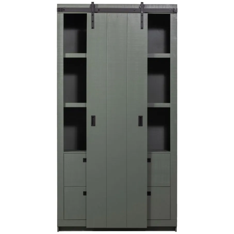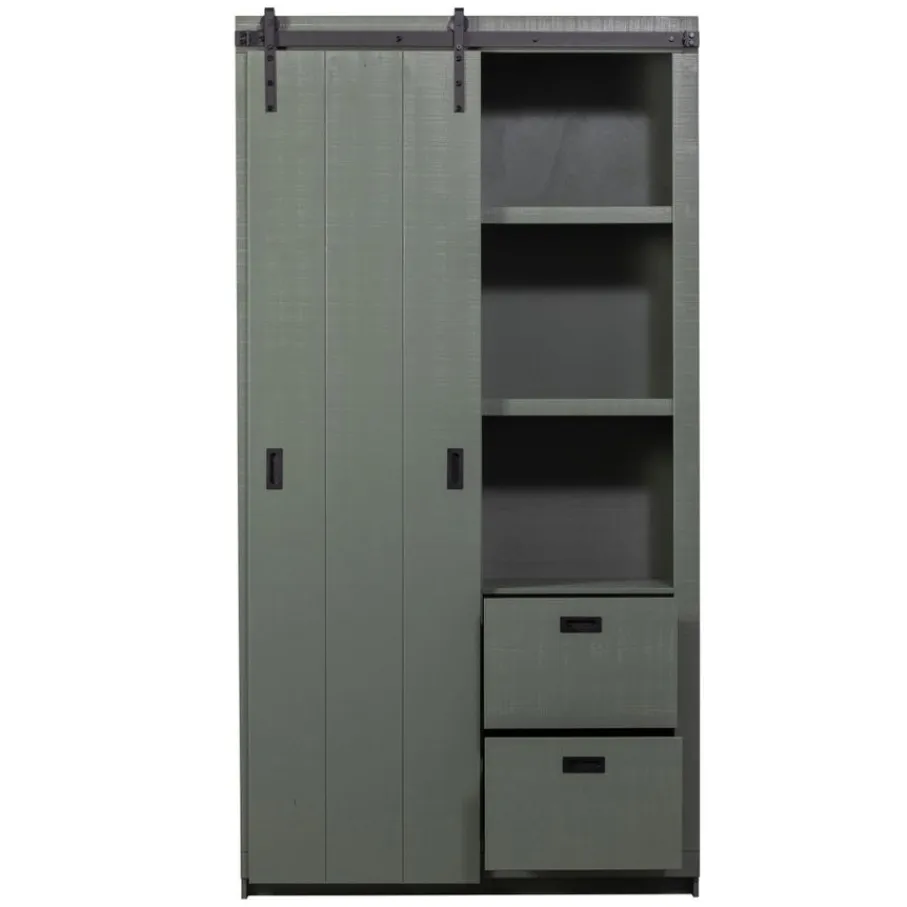 De schuifdeurkast heeft 4 dikke legplanken en aan de onderzijde 4 lades. De schuifdeur hangt aan een zwart metalen rails. Deze deur houdt één zijde altijd zichtbaar en de andere zijde afgedekt. De lades en deur zijn voorzien van zwart metalen cassette grepen.