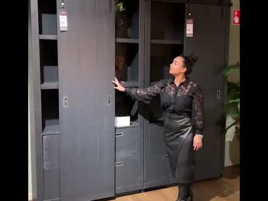 De schuifdeurkast heeft 4 dikke legplanken en aan de onderzijde 4 lades. De schuifdeur hangt aan een zwart metalen rails. Deze deur houdt één zijde altijd zichtbaar en de andere zijde afgedekt. De lades en deur zijn voorzien van zwart metalen cassette grepen.