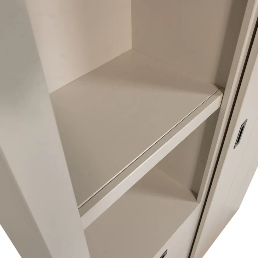 Deze kast combineert open en gesloten opbergruimte. De schuifdeur kan naar links of rechts worden bewogen om een van de twee secties te onthullen of te verbergen. De indeling bestaat uit vier legplanken en twee ruime lades, waardoor er voldoende plek is voor zowel decoratieve items als spullen die je liever uit het zicht bewaart. Elke legplank heeft een draagvermogen van 10 kg.