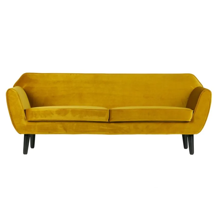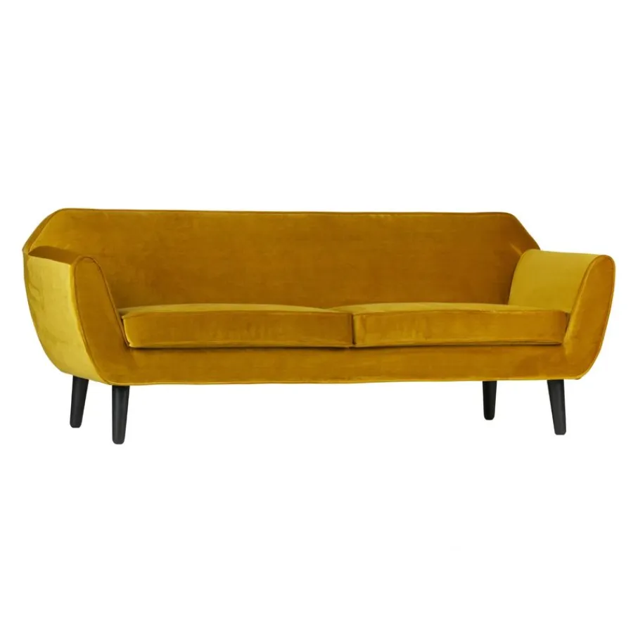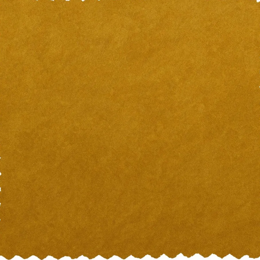 Bank Rocco is bekleed met een okergele velvet met een luxe uitstraling. De fluwelen stof voelt fijn aan en heeft een mooie, matte glans. Deze volle en zware kwaliteit velvet bestaat uit 100% polyester en heeft een Martindale van 100.000. Het materiaal is kleurvast en zal niet snel pillen en daarom is het geschikt voor intensief woongebruik.