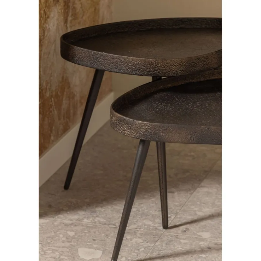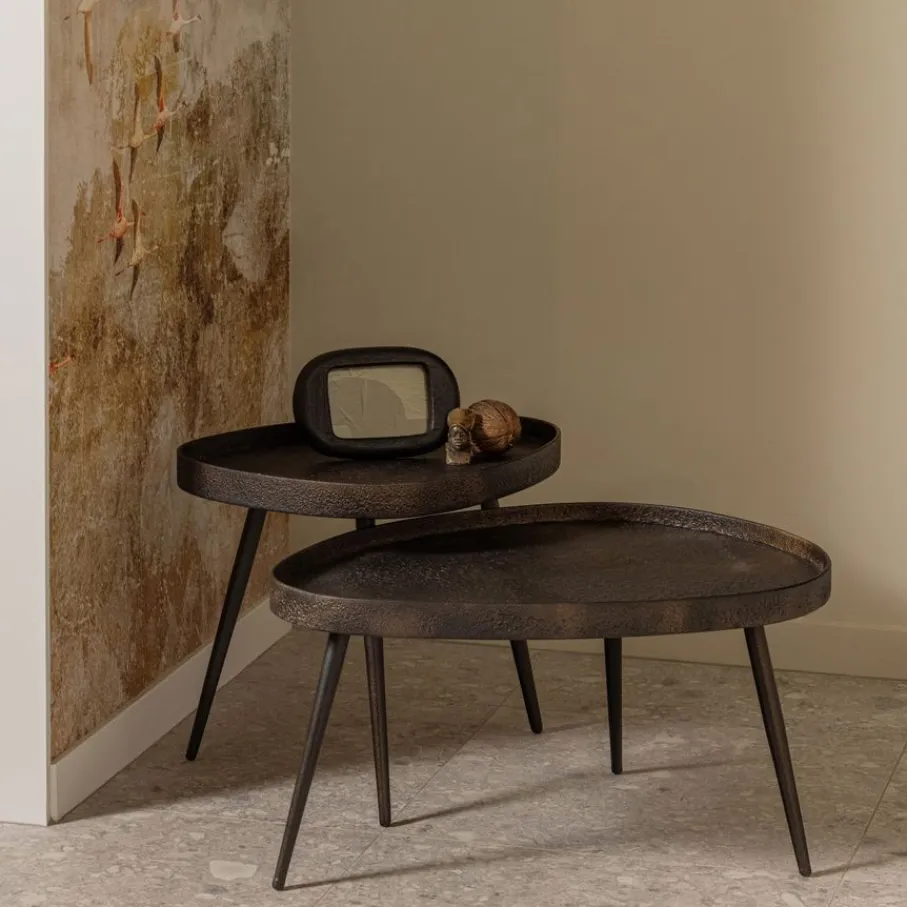 - Een unieke blikvanger voor je interieur: Met hun organische vormen, de stoere combinatie van metaal en hout en de antique bronze afwerking, zijn deze tafels een waar kunstwerk in huis.