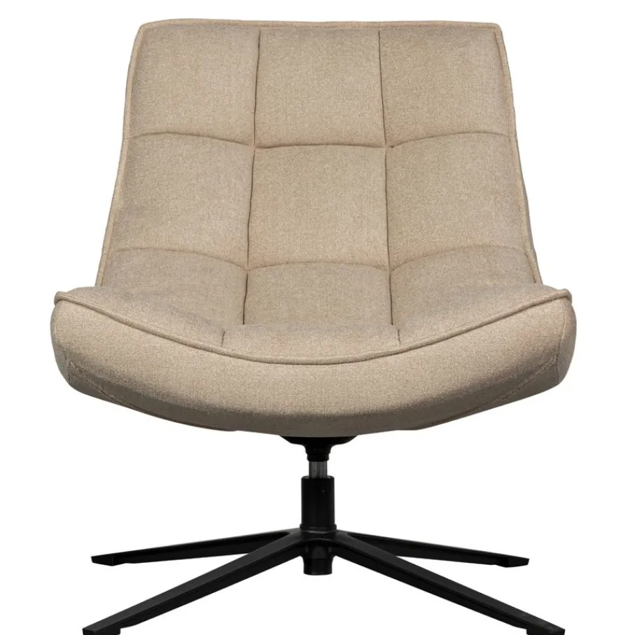 De Maudi draaifauteuil is bekleed met een geweven stof van van 100% polyester, met subtiele beige kleurnuances. Deze geweven stof voelt zacht en glad aan en is, met een Martindale van 50.000, geschikt voor redelijk intensief woongebruik.