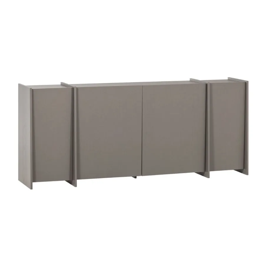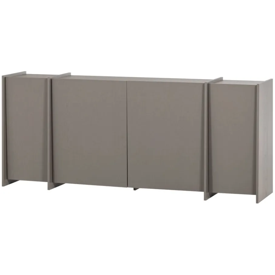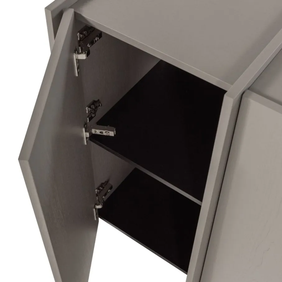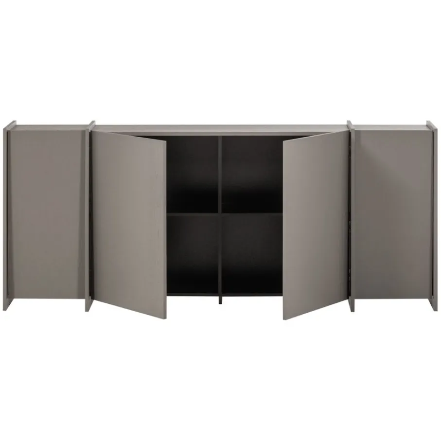 Achter de vier deuren bevinden zich vier ruime opbergvakken, elk voorzien van een legplank. Dit creëert een overzichtelijke en opgeruimde indeling voor al je spullen. De binnenzijde van de kast is afgewerkt met spaanplaat in een donkere kleur, wat een fraai contrast vormt met de warmgrijze buitenzijde.