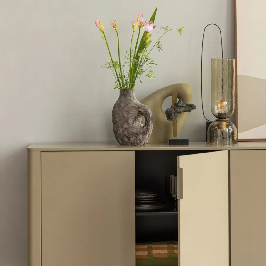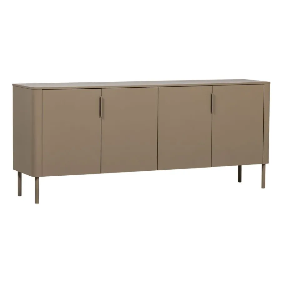 Het Gunnar dressoir heeft 2 dubbeldeurs vakken voor handige opbergruimte. Elk vak heeft er een plank in ter vakverdeling. De kast is voorzien van metalen handgrepen met een strakke vormgeving en dezelfde Mud kleur.