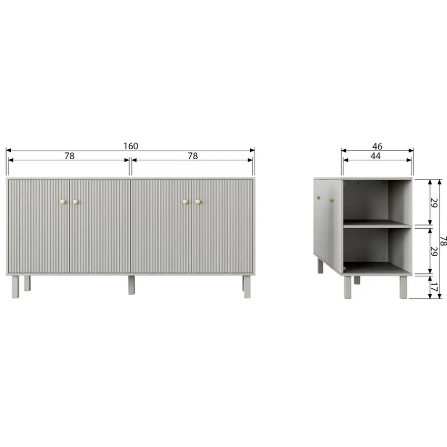 Dressoir Madu heeft 4 deuren met goudkleurige knopjes. Achter deze deuren bevinden zich 4 legplanken. De ruimtes hebben een breedte van 76 cm en een diepte van 43 cm.