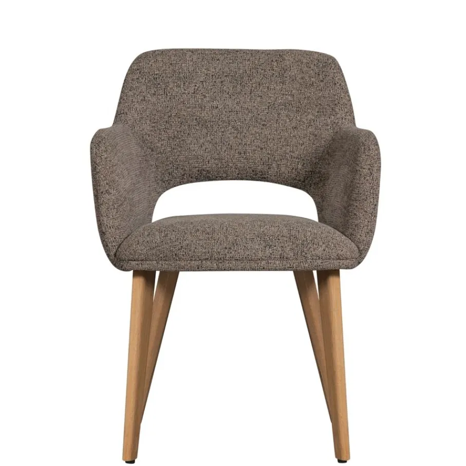 De armstoel is bekleed met een geweven chenille stof met een zachte grip. Bovendien is de stof voorzien van een matte glans die zorgt voor een luxueuze uitstraling. Het is gemaakt van 100% polyester en heeft een Martindale van 30.000. De stof is sterk en voelt comfortabel aan. De taupe kleur is een gemêleerde tint die makkelijk combineert.