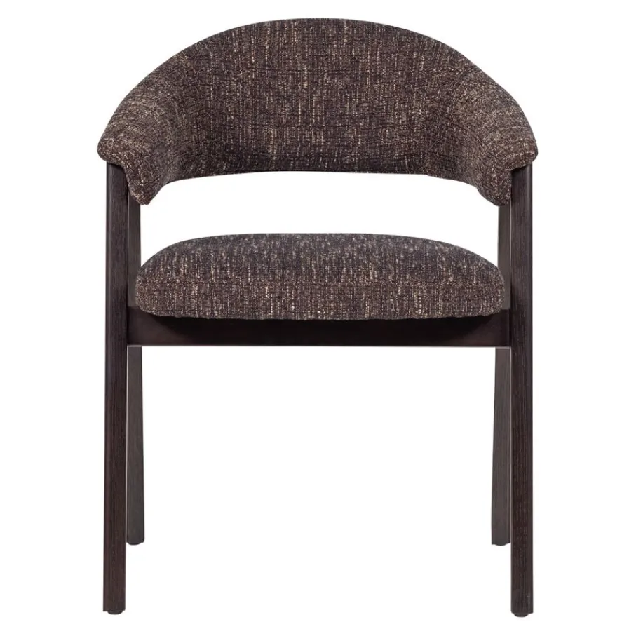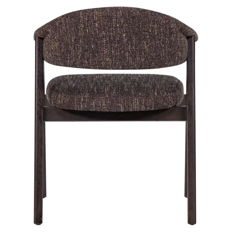 Eetkamerstoel Tunar van WOOOD brengt karakter en een rustige basis in de eetkamer. Het ontwerp kenmerkt zich door de vloeiende lijn van de rugleuning die overgaat in de armleuningen. Het frame van FSC-gecertificeerd eikenhout, met zijn zichtbare nerftekeningen, geeft elke stoel een unieke uitstraling. Dankzij dit toegankelijke design past eetkamerstoel Tunar in diverse woonrstijlen en creëert hij een uitnodigende sfeer aan de eettafel.